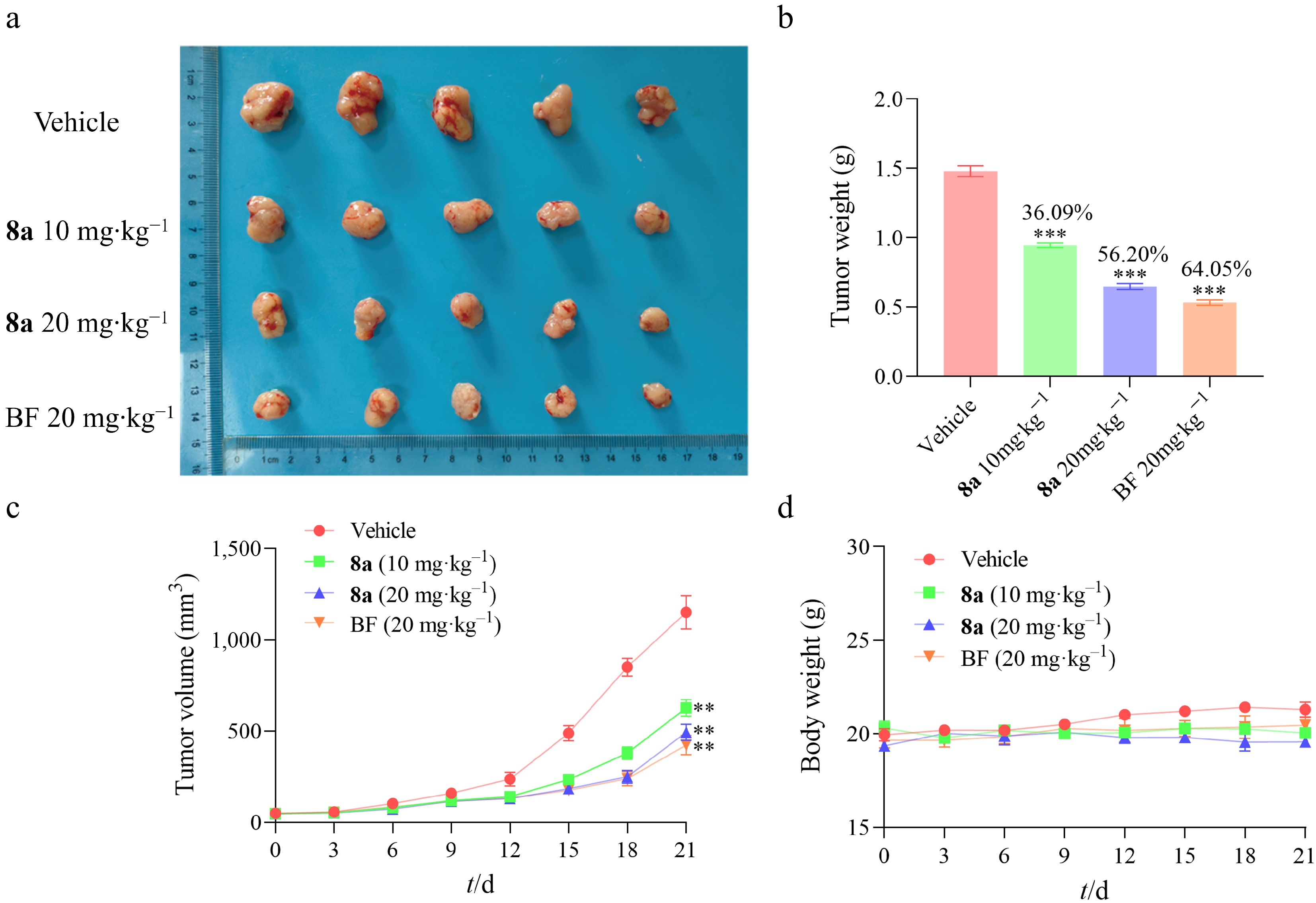 • Due to the antitumor activity exhibited by compound 8a in vitro, we further established an animal model of HT-29 xenograft tumor to evaluate its antitumor effect in vivo. HT-29 cells were subcutaneously injected into the right flank of female nude mice to induce solid tumors. Bazedoxifene, a marketed drug regarded as a potential target for gp130, was selected as a positive control. The mice were then randomly divided into three groups and treated with compound 8a (10 and 20 mg·kg−1) or Bazedoxifene (20 mg·kg−1). The results revealed that compound 8a significantly inhibited tumor growth, with a 36.09% reduction in tumor weight in the 10 mg/kg group and a 56.20% reduction in the 20 mg·kg−1 group (Fig. 7ac). Throughout the experiment, there was no significant decrease in the body weight of the mice (Fig. 7d), indicating that compound 8a had no apparent toxicity.