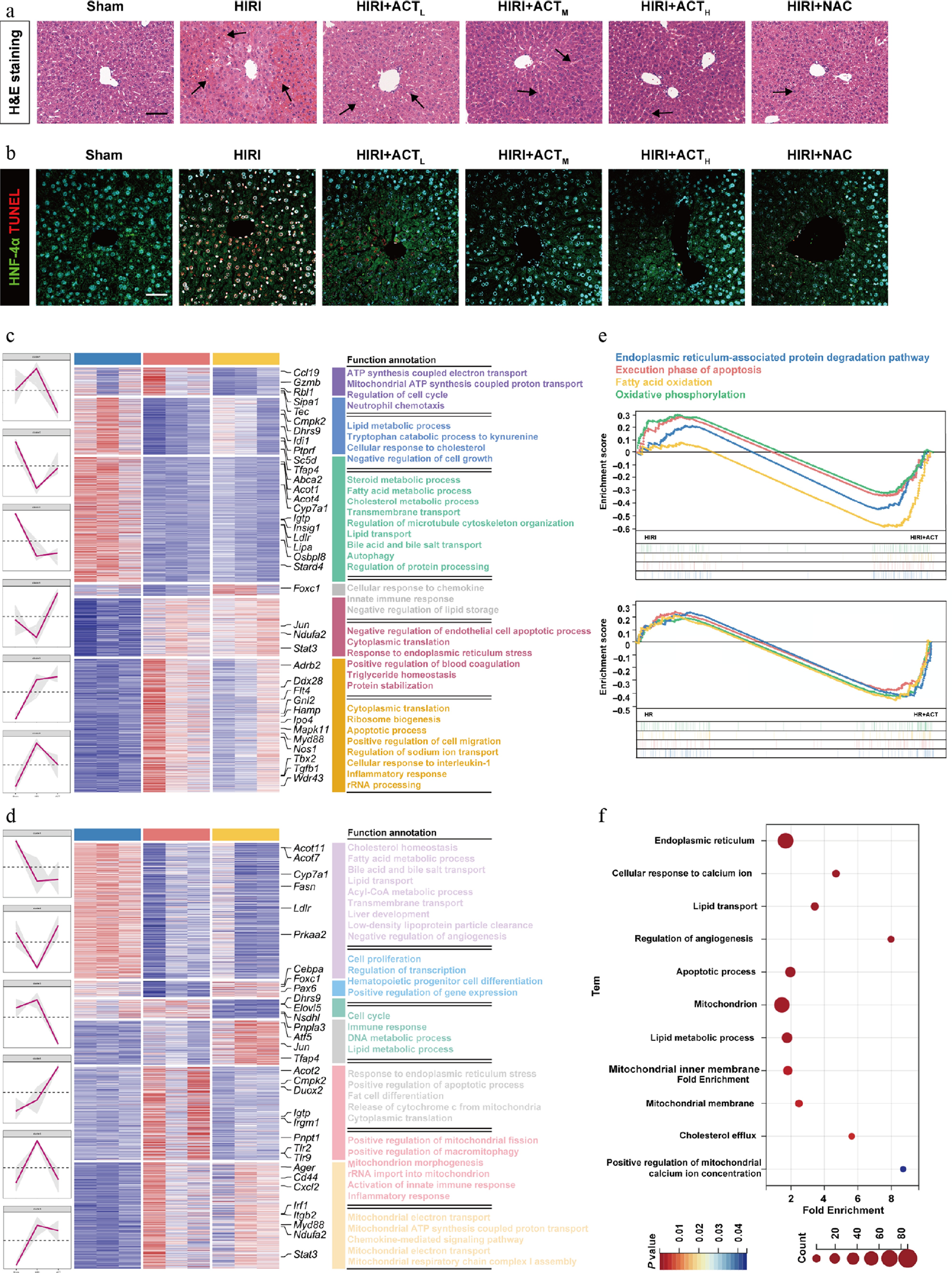 ACT alleviated liver damage in HIRI mice, and HR-stimulated hepatocytes. (a) Representative images of H&E staining in different groups (arrows indicate regions of liver injury, including inflammatory foci). Scale bar = 100 μm. (b) Representative images of immunohistochemistry staining for HNF-4α and TUNEL in different groups. Scale bar = 100 μm. The heatmap of critical DEGs with red lines indicating different clusters in the (c) whole livers and (d) primary hepatocytes, isolated from different mice groups. (e) GSEA analysis from HIRI and HIRI + ACT groups in mouse livers (upper panel), and primary hepatocytes (below panel). (f) GO enrichment analysis results of the whole liver, and primary hepatocyte DEGs visualized with a bubble diagram.