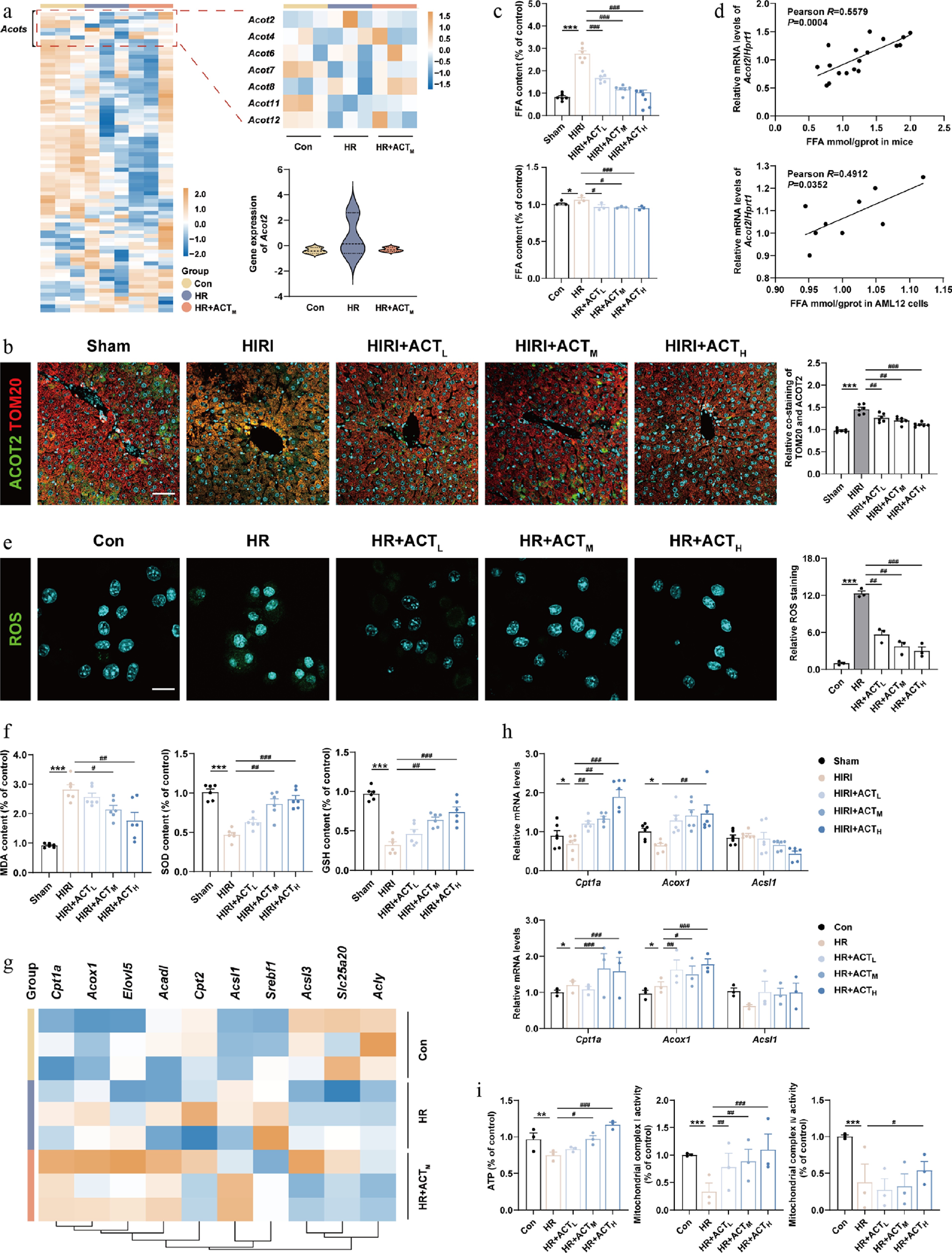 • Subsequently, a heatmap analysis of RNA-seq data from primary hepatocytes was conducted, focusing on genes involved in lipid synthesis, transport, and metabolism, especially those from the Acyl-CoA thioesterases (ACOTs) family. Hierarchical clustering of DEGs is shown in Fig. 2a, a notable upregulation of Acot2, a target responsible for hydrolyzing Acyl-CoAs to FFAs in hepatocytes but not other ACOTs families, was detected in the HIRI group, instead of the HIRI + ACT group. Consistently, the hepatic ACOT2 expression and its co-distribution with mitochondrial marker outer mitochondrial membrane 20 (TOM20) were all increased in the livers of HIRI mice, but were reversed after ACT treatment (Fig. 2b; Supplementary Fig. S3a). The translational changes of ACOT2 in AML12 cells exhibited the same trend as those in mouse livers (Supplementary Fig. S3b). Due to the intense intervention of ACOT2, the hepatic FFA content was significantly increased following HIRI surgery (Fig. 2c, upper panel), and more importantly, was positively correlated with the changes in Acot2 mRNA expression in mouse livers (Fig. 2d, upper panel). Meanwhile, ACT reversed the accumulation of FFA and broke its positive correlation with Acot2 caused by HIRI surgery. Further analysis revealed a similar trend in both the content of FFA and its correlation with Acot2 mRNA in hepatocytes under HR insult and ACT administration (Fig. 2c and d, lower panels). Furthermore, accumulated FFA usually results in the overproduction of mitochondrial ROS through multiple pathways. As shown in Fig. 2e and f; Supplementary Fig. S3c, ACT mitigated HR-induced ROS accumulation and oxidative stress, as characterized by a reduction in the fluorescent area of DCFH-DA and malondialdehyde (MDA) levels (a typical marker indicating lipid peroxidation), increased glutathione (GSH) and superoxide dismutase (SOD) levels (recognized indicators of antioxidant capacity). Oxidative reactions are crucial for maintaining mitochondrial homeostasis through preventing lipid deposition and facilitating respiration to generate energy. FFA biological processes-related genes involved in the FA synthesis like Acyl-CoA synthetase long-chain family member 1 (Acsl1), FA transport and oxidation-like carnitine palmitoyl transferase 1a (Cpt1a), and Acyl-CoA oxidase 1 (Acox1) are exhibited in Fig. 2g. Notably, changes in genes associated with β-oxidation were particularly significant. Consistently, the downregulated mRNA expression of FA β-oxidation-related genes in mitochondria induced by HIRI or HR were markedly restored by ACT administration (Fig. 2h). Furthermore, the ACT-treated AML12 cells exhibited superior mitochondrial function than the HR group, evidenced by increased levels of ATP, as well as enhanced activities of mitochondrial complex I and IV (Fig. 2i). These results suggest that ACT reduces FFA hyperproduction by decreasing ACOT2 expression, and selectively reactivates ACOX1 to restore oxidative metabolism, thereby reshaping the redox balance in mitochondria.