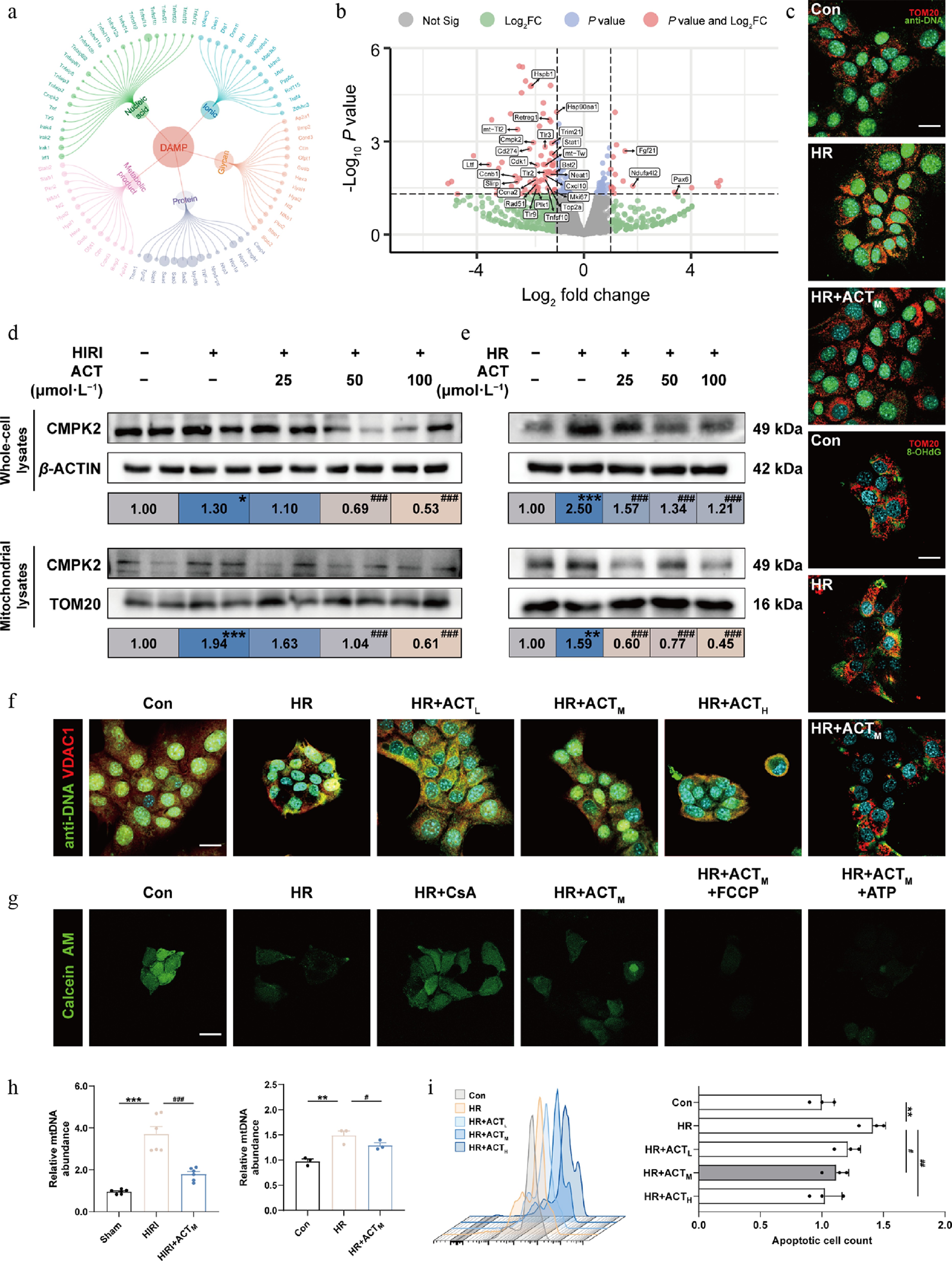 ACT inhibited the synthesis and release of mtDNA in hypoxic hepatocytes by suppressing CMPK2. (a) Circle network of DAMP molecules. (b) Volcano plots of DEG expression in primary hepatocytes from HIRI, and HIRI + ACT groups. (c) Representative images of immunofluorescence staining for TOM20 (594 nm), anti-DNA (488 nm), 8-OHdG (488 nm), and DAPI (405 nm) in AML12 cells. Scale bar = 20 μm. (d), (e) The protein expression levels of CMPK2 in whole cells and mitochondria of mouse livers and AML12 cells were normalized with β-ACTIN or TOM20. (f) Representative images of immunofluorescence staining for VDAC1 (594 nm), anti-DNA (488 nm), and DAPI (405 nm) in AML12 cells. Scale bar = 20 μm. (g) Representative images of immunofluorescence staining for Calcein AM (488 nm) and in AML12 cells. Scale bar = 20 μm. (h) Left panel, mtDNA level in mouse serum; right panel, mtDNA level in the culture medium of AML12 cells. (i) The flow cytometry results of JC-1 analysis in AML12 cells. Statistical significance: * P < 0.05, ** P < 0.01, *** P < 0.001, compared with control group; # P < 0.05, ## P < 0.01, ### P < 0.001, compared with the model group (Data are presented as the mean ± SEM, n = 3 for cell experiments, n = 6 for mice experiments).