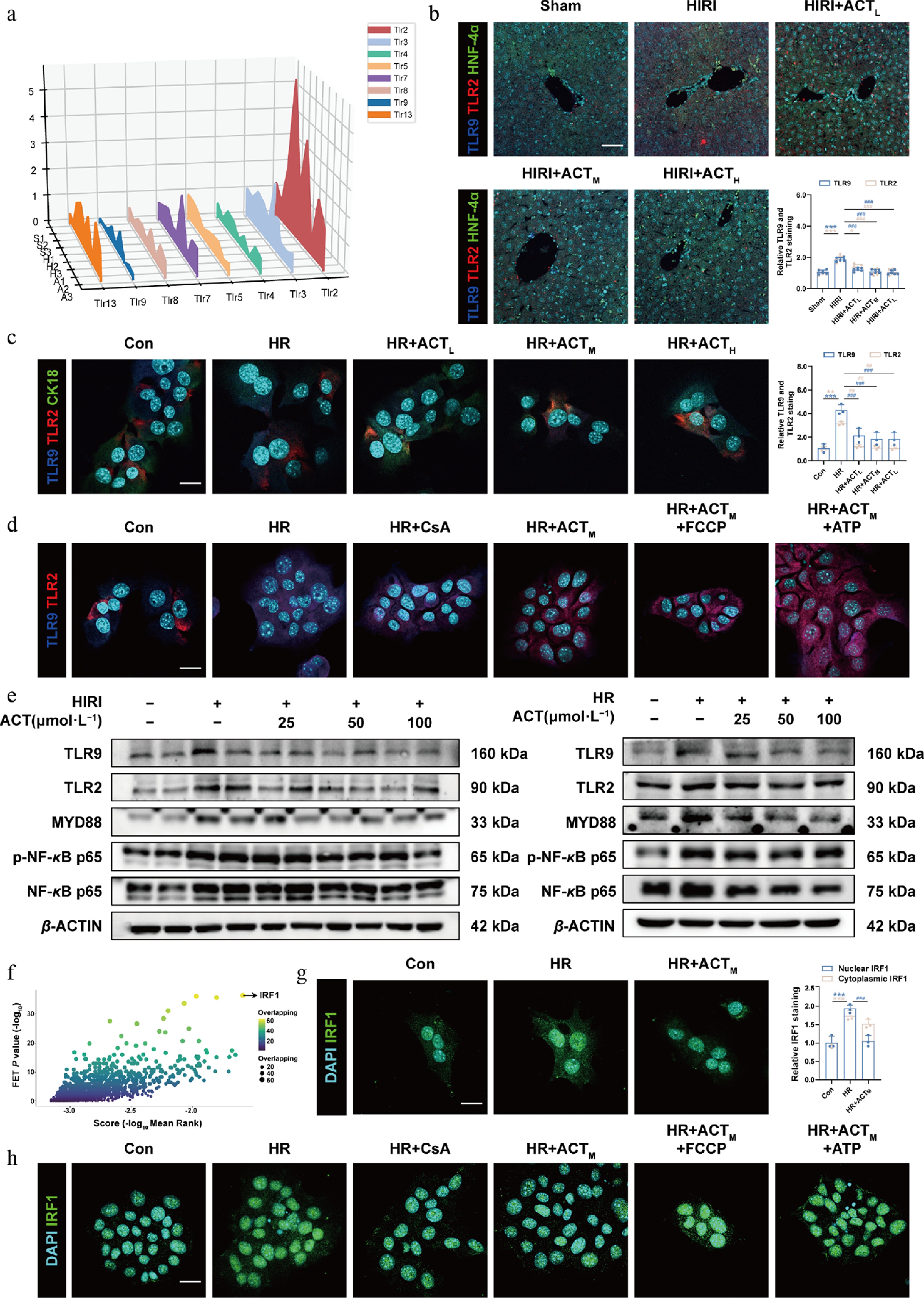 • After analyzing the primary response receptor profiling based on hepatocyte-specific RNA-sequencing data, we predicted that several TLR expressions, like Tlr2 were dramatically increased after HR stimulation and decreased after ACT intervention. Although the expression levels of Tlr9 and Tlr7 were not high in the HR group, a significant reduction was observed after ACT administration, particularly with a greater P-value noted for the Tlr9 gene (Fig. 4a). It is noteworthy that TLR9 is predominantly expressed in endosomes and is recognized for its response to mtDNA derived from both intracellular and extracellular sources[20]. While there is currently no literature indicating that TLR2 can directly respond to mtDNA, it may sense other DAMPs triggered by mtDNA[21,22]. Consistent results were observed in both qPCR analysis and multiple immunofluorescence staining, demonstrating the upregulation of TLR2 and TLR9 in both HIRI mouse livers and hepatocytes (marked by hepatocyte markers HNF-4α or CK18) subjected to HR; however, a downregulation was noted following the administration of ACT (Fig. 4b and c; Supplementary Fig. S5aS5c). As shown in Fig. 4d and Supplementary Fig. S6a, the closure of mPTP caused by CsA markedly decreased the relative fluorescence intensity of TLR2 and TLR9 even under HR conditions; while continuous opening of mPTP induced by FCCP and ATP stimulated the expression of these two receptors, it was no longer reversed by ACT. All TLRs except TLR3 transmit signaling via the MyD88 pathway and activate the nuclear factor-kappa B (NF-κB) transcription factor for exacerbating liver inflammation[23]. The protein levels of TLR9, MyD88, and p-NF-κB p65 were markedly increased in both the HIRI and HR group, which were reduced by ACT treatment (Fig. 4e; Supplementary Fig. S6b). The effect of ACT on reducing TLR2 expression in vitro was not significant. Next, to further define which transcription factors or downstream genes were altered by NF-κB, we utilized the CHEA3 database for prediction and finally noticed IRF1 (Fig. 4f). Recently, NF-κB p65 was reported to bind to the Irf1 promoter region and lead to its transcriptional activation[24], which was further translocated into the nucleus, and functioned as a transcription factor for activating downstream gene networks. As depicted in Fig. 4g and Supplementary Fig. S6c, the fluorescence expression and nuclear localization of IRF1 were significantly downregulated by ACT compared with the HR group. However, this ACT-mediated restrictive translocation effect was completely inhibited under the continuous activation of mPTP (Fig. 4h; Supplementary Fig. S6d).