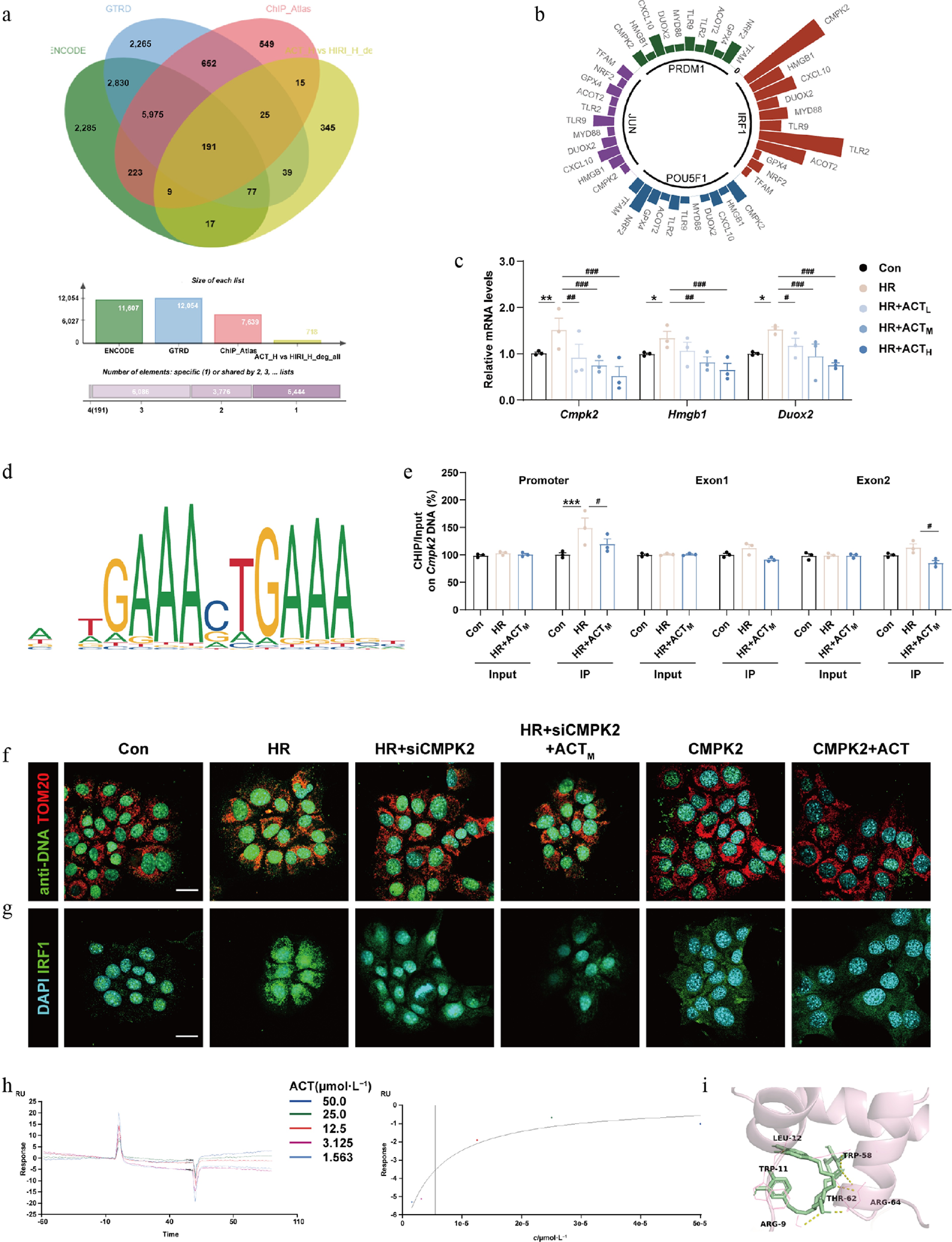 • To further demonstrate whether ACT influences the activation of mito-DAMPs-related targets through the inhibition of IRF1 nuclear translocation, we integrated the DEGs from the HIRI + ACT, vs HIRI groups (yellow shaded area) with gene information from the databases of ENCODE (green shaded area), GTRD (blue shaded area) and the CHIP_Atlas (pink shaded area) associated with IRF1 downstream targets (Fig. 5a). We focused on the intersection of 191 genes across four gene sets, which primarily encompassed domains including mtDNA replication, cellular redox homeostasis, and inflammatory reaction. Additionally, we also performed reverse prediction analysis on the key genes among these 191 DEGs, revealing that the major potential transcription factor was IRF1 (Fig. 5b). Combining the above two prediction methods, we selected genes that exhibited significant fold changes for further investigation, including Cmpk2, Hmgb1, and Duox2. The mRNA expression of Cmpk2, Hmgb1, and Duox2 were elevated in the HIRI and HR group, but were reduced by ACT both in mouse livers and hepatocytes (Fig. 5c; Supplementary Fig. S7a). IRF1 can sense a signal from the TLR-MyD88-TRIF pathway, bind to the promoter of CMPK2 and subsequently induce its transcription[25]. Subsequently, to investigate whether ACT influences CMPK2 transcription through IRF1, we utilized the biological prediction website JASPAR to identify the target binding site of IRF1 on CMPK2 (Fig. 5d). Furthermore, our ChIP-qPCR results in AML12 cells confirmed that HR promoted the combination between IRF1 and the promoter or exon 2 regions of Cmpk2 in hepatocytes, which was largely reversed by ACT (Fig. 5e). We then transiently transfected siRNA-targeting Cmpk2, or treated purified CMPK2 protein to validate the indispensable role of CMPK2 in triggering mtDNA leakage and subsequent changes in downstream targets. Notably, the knockdown of Cmpk2 synergistically interacted with ACT, leading to a decrease in mtDNA content (Fig. 5f; Supplementary Fig. S7b), the inhibition of IRF1 nuclear translocation (Fig. 5g; Supplementary Fig. S7c), following transcription of Irf1 and Hmgb1 (Supplementary Fig. S7d). Besides, recombinant CMPK2 proteins efficiently antagonized the therapeutic effect of ACT on mtDNA-TLRs/NF-κB-IRF1 signaling (Fig. 5f and g; Supplementary Fig. S7b and S7c). Furthermore, the SPR assay showed that ACT was able to bind to the IRF1 protein (Fig. 5h) at a specific region: (TRP38 LYS39 HIS40 ALA41 ALA42 PRO74 LYS75 THR76 LYS78 ALA79 ARG82 MET85 ASN86 SER87 LEU88 PRO89 ILE91 GLU92 GLU93 VAL94 LYS95 GLN97 SER98 ARG99 ASN100 LYS101 SER103 SER104 ALA105 VAL106 ARG107) (Fig. 5i, Vina score = −7.4), which might influence where IRF1 binds to the promoter region of CMPK2.
