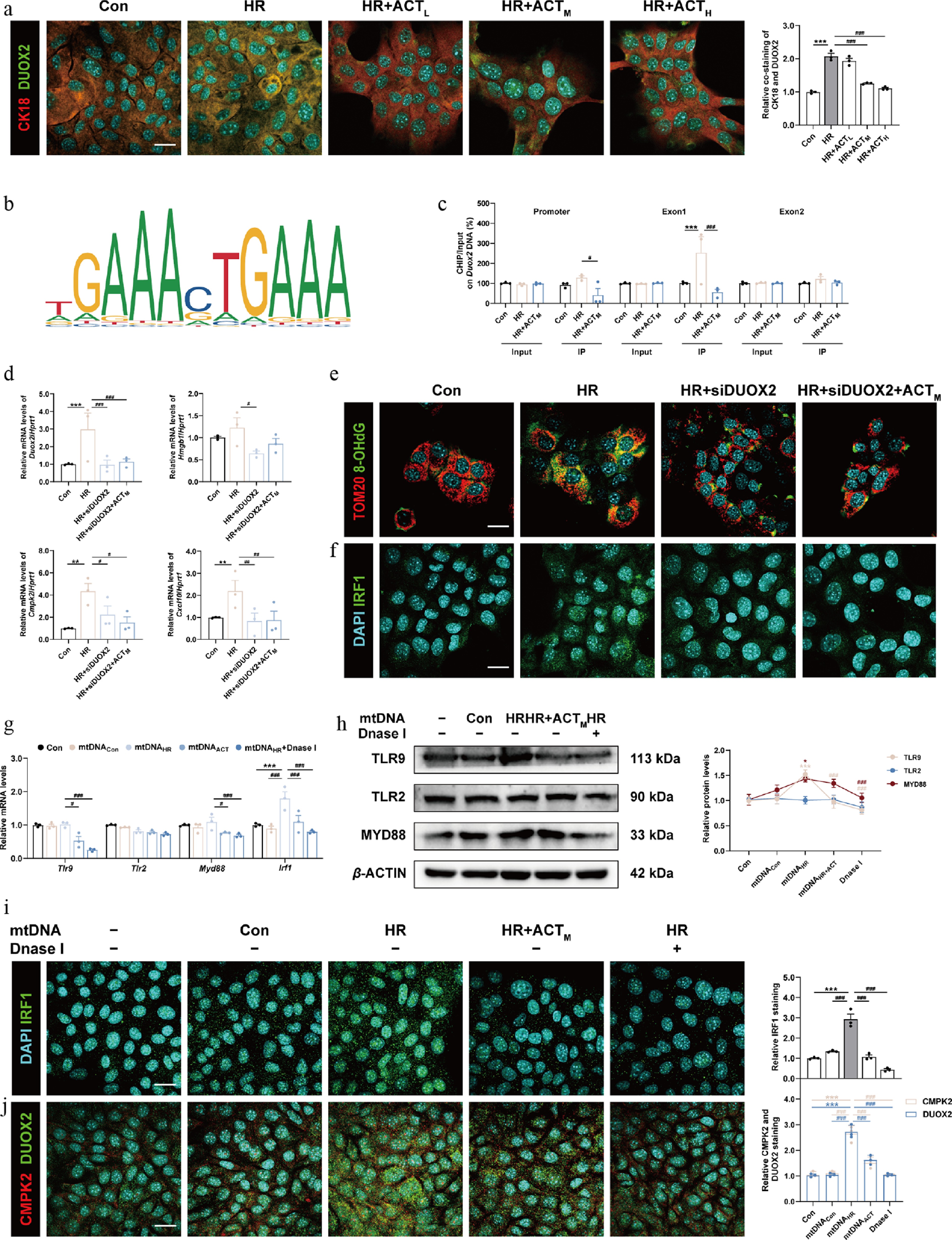 • Since aberrant production of ROS caused by DUOX2 can exacerbate oxidative stress and hepatocyte damage, we checked and found the increased co-localization of DUOX2 and CK18 in the HR group, which was reversed by ACT (Fig. 6a; Supplementary Fig. S8a). The biological prediction website JASPAR was used to analyze whether DUOX2 was a potential downstream target of IRF1 and predicts the target binding site (Fig. 6b). Additionally, our ChIP-qPCR results in AML12 cells demonstrated that HR facilitated the combination of IRF1 with the promoter or exon 1 regions of Duox2 in hepatocytes, which was significantly reversed by ACT (Fig. 6c). To further prove the involvement of DUOX2 in increased ROS production and subsequent redox damage in AML12 cells, we silenced Duox2 by transfecting siRNA with a specific sequence. The siRNA targeting Duox2 triggered a corresponding decrease in the mRNA levels of Duox2, Cmpk2, Hmgb1, and Cxcl10 (Fig. 6d), and strongly limited ROS generation compared to cells subjected to HR (Supplementary Fig. S8b), which had a synergistic effect with ACT. As expected, after HR insult, the level of ox-mtDNA released into the cytosol (Fig. 6e; Supplementary Fig. S8c) and the nuclear translocation of IRF1 (Fig. 6f; Supplementary Fig. S8d) was increased, but was largely reversed by siDUOX2 with ACT administration. Next, we extracted mtDNA from the culture medium of the different hepatocyte groups, and concentrated purified mtDNA for further cell transfection into another set of hepatocytes. As shown in Fig. 6g and h, the mRNA and protein levels of TLR9 and MYD88, but not TLR2, were upregulated in the mtDNA-HR group compared with the mtDNA-Con group, which were decreased by mtDNA-HR + ACT or totally blocked by DNase I intervention. Furthermore, it is noteworthy that DNase I counteracted the increased transcription and nuclear translocation of IRF1 and subsequent CMPK2 and DUOX2 expression caused by mtDNA-HR transfection (Fig. 6g, i, j; Supplementary Fig. S9a and S9b). These results suggest that the generation and autocrine release of ox-mtDNA may represent the downstream factor of IRF1, and the final oxidative damage driving force, which is also a crucial part of the ACT's protection mechanism against HIRI.