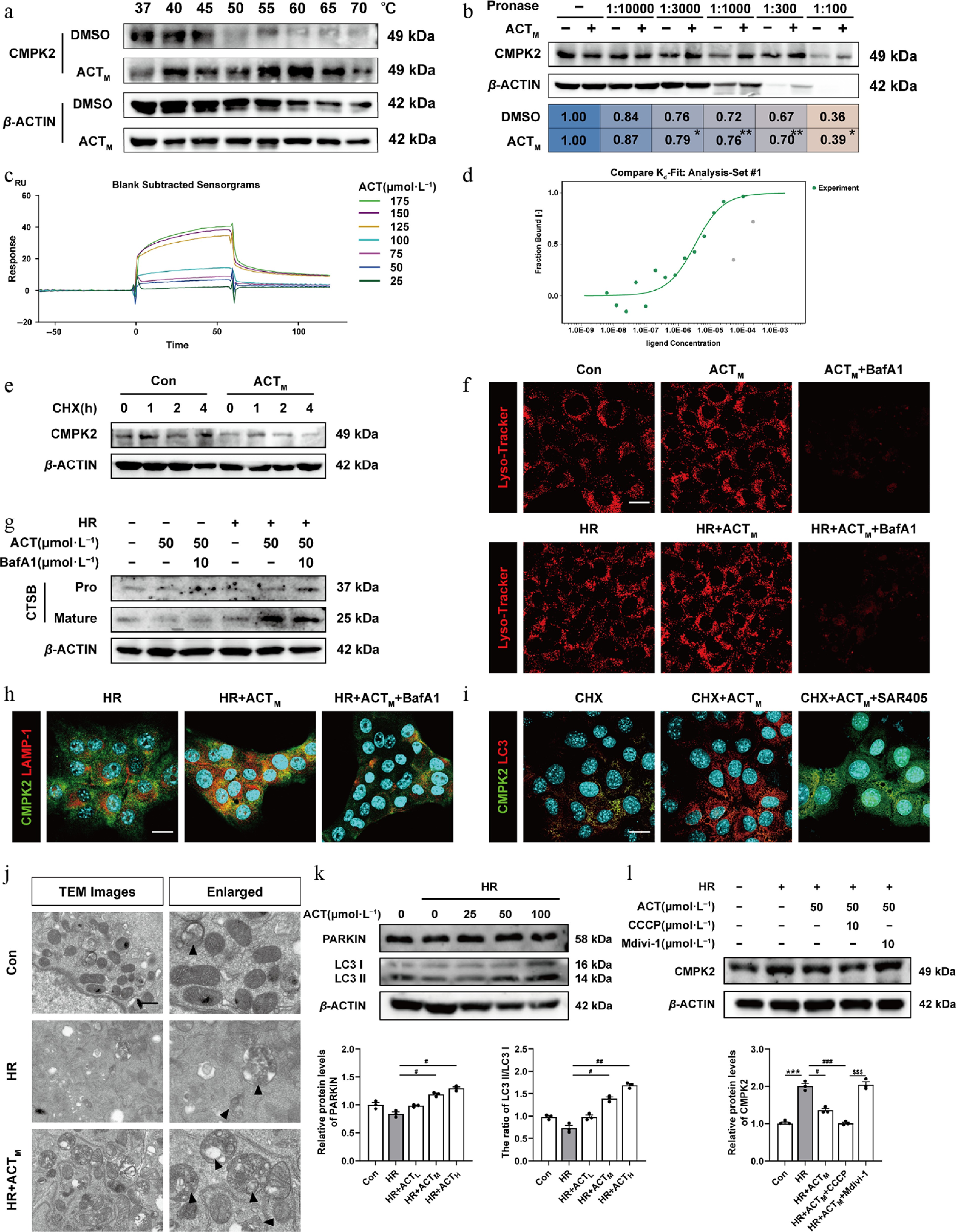 ACT directly combined to, and induced the degradation of CMPK2 via activating mitophagy. The (a) CETSA, and (b) DARTS assay. The (c) SPR result, and (d) MST analysis of ACT binding to CMPK2. (e) The protein expression of CMPK2 in the CHX chase assay of AML12 cells was normalized with β-ACTIN. (f) Representative images of immunofluorescence staining for Lyso-Tracker (594 nm), and DAPI (405 nm) in AML12 cells. Scale bar = 20 μm. (g) The protein expressions of pro-and mature-CTSB in AML12 cells were normalized with β-ACTIN. (h), (i) Representative images of immunofluorescence staining for CMPK2 (488 nm), LAMP-1 (594 nm), LC3 (594 nm), and DAPI (405 nm) in AML12 cells. Scale bar = 20 μm. (j) Representative TEM images of mitochondria in AML12 cells. Scale bar = 20 μm. The protein expressions of (k) PARKIN, LC3-I, LC3-II, and (l) CMPK2 in AML12 cells were normalized with β-ACTIN. Statistical significance: * P < 0.05, ** P < 0.01, *** P < 0.001, compared with relative control groups; # P < 0.05, ## P < 0.01, ### P < 0.001, compared with the HR group; $^{{\$}{\$}{\$}} $ P < 0.001, compared with the HR + ACTM + Mdivi-1 group (Data are presented as the mean ± SEM, n = 3).
