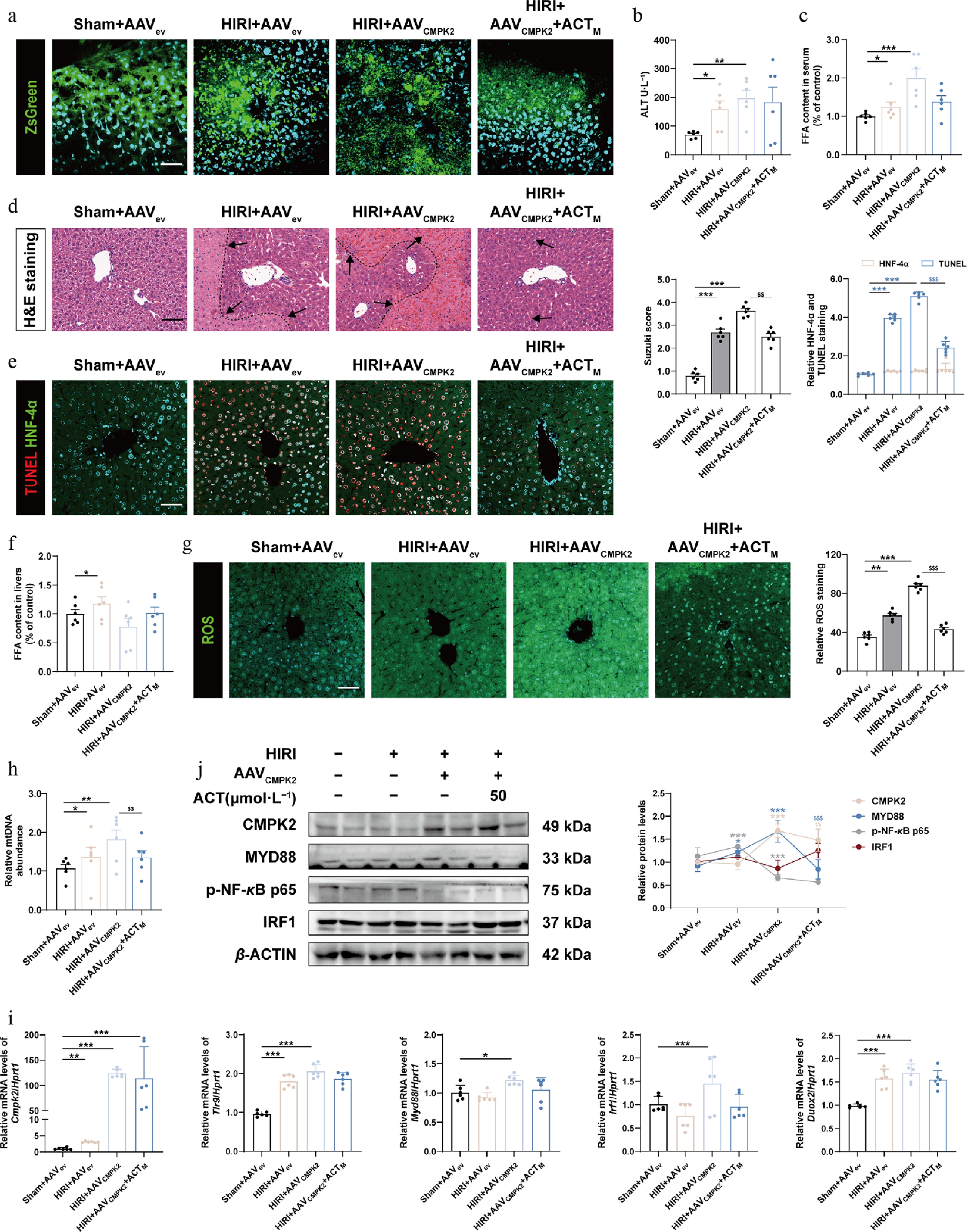 • To further corroborate the role of CMPK2-mediated hepatocyte lipid metabolism injury in HIRI and whether it is unique to ACT therapy, the CMPK2-carrying AAV8 with ZsGreen fluorescein labeling was successfully injected into mice via the tail vein before HIRI surgery and ACT pre-administration (Fig. 8a; Supplementary Fig. S13a). Hepatic function indices (AST and ALT in the serum), along with lipid contents (FFA and total cholesterol [TC] in serum), indicated that liver hypoxic damage and abnormal lipid metabolism were aggravated by CMPK2 overexpression in hepatocytes, which couldn't be alleviated even with the presence of ACT (Fig. 8b and c; Supplementary Fig. S13b). Meanwhile, histological examination and co-staining of TUNEL and HNF-4α in CMPK2-overexpression livers revealed significant signs of extensive inflammatory cell infiltration and hepatocellular necrosis, which was improved with the intervention of ACT to some extent (Fig. 8d and e). Besides, the hepatic level of FFA was downregulated after injection with CMPK2-carrying AAV8 and ACT treatment (Fig. 8f). To further investigate the stimulatory effect of CMPK2 overexpression on hepatic lipid metabolism, the alterations of oxidative stress markers, including ROS, MDA, and GSH, were analyzed in different groups. As shown in Fig. 8g; Supplementary Fig. S13c and S13d, the fluorescence staining of DCFH-DA and the level of MDA were all significantly increased, and the content of GSH was decreased in the HIRI + AAVCMPK2 group and only slightly changed after ACT intervention. Notably, ACT restrained the secretion of mtDNA into the serum compared with the HIRI + AAVCMPK2 group (Fig. 8h). These results suggest that the explosive increase of CMPK in hepatocytes directly stimulates mtDNA production and simultaneously affects ROS accumulation caused by excessive FFA oxidation. Furthermore, we validated the expression changes of several key targets involved in CMPK2-centered signaling pathways among various groups. The changes of CMPK2, TLR9, MYD88, p-NF-κB, and IRF1, but not HMGB1, TLR2, ACOT2, or DUOX2, were all significantly elevated in the HIRI + AAVCMPK2 group, but almost unchanged after ACT pre-administration in mouse livers (Fig. 8i and j; Supplementary Fig. S13e and S13f). Taken together, while ACT can directly bind to, and inhibit the hepatic expression of CMPK2, it is unable to withstand the adverse effects caused by the stimulation of exogenous CMPK2 and the subsequent lipid metabolism disorders under HIRI conditions.
