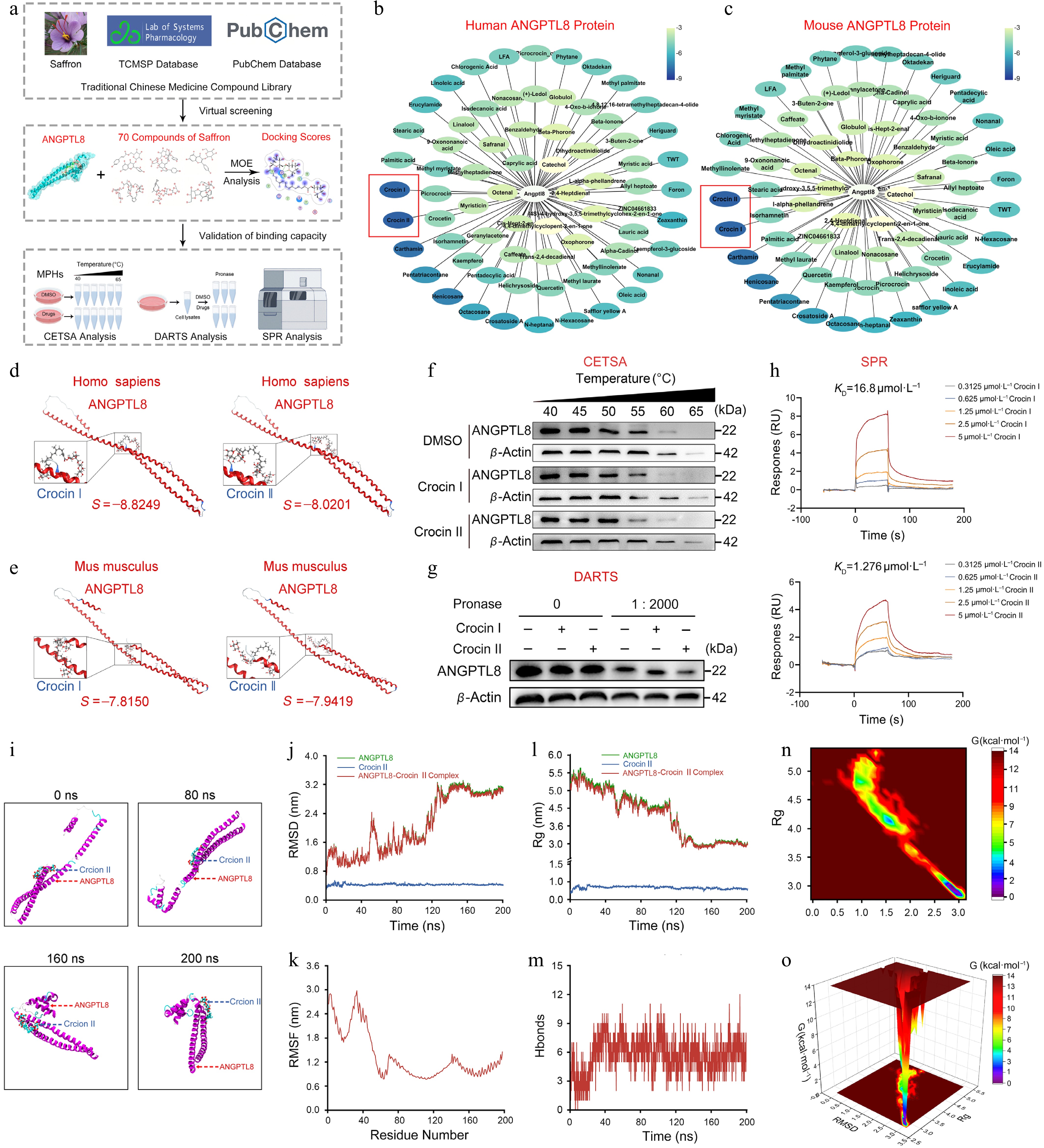 Compound screenings identify Crocin II as a potential drug targeting ANGPTL8. (a) Workflow for screening small-molecule compounds targeting ANGPTL8. (b) MOE analysis of binding potentials of natural small-molecule compounds on human ANGPTL8. (c) MOE analysis of binding potentials of natural small-molecule compounds on mouse ANGPTL8. (d) The binding pattern of human ANGPTL8 with Crocin I and Crocin II. (e) The binding pattern of mouse ANGPTL8 with Crocin I and Crocin II. (f) Mouse PHs were exposed to DMSO, 100 μmol·L−1 Crocin I or Crocin II for 3 h, then subjected to CETSA analysis. Western blot analysis for the protein levels of ANGPTL8. (g) Mouse PHs lysates were incubated with DMSO, 100 μmol·L−1 Crocin I or Crocin II for 2 h at 25 °C, followed by digestion with pronase for 30 min at 37 °C. Western blot analysis for the protein levels of ANGPTL8. (h) The direct combination of ANGPTL8 with Crocin I or Crocin II was evaluated using SPR. (i) Representative snapshots of molecular dynamics processes. (j) RMSD curves. (k) RMSF curve. (l) Rg curves. (m) Fluctuation curve of the number of hydrogen bonds. (n) The two-dimensional mapping of the free energy landscape. (o) The three-dimensional mapping of the free energy landscape. Data are presented as the mean ± SEM, n = 3.