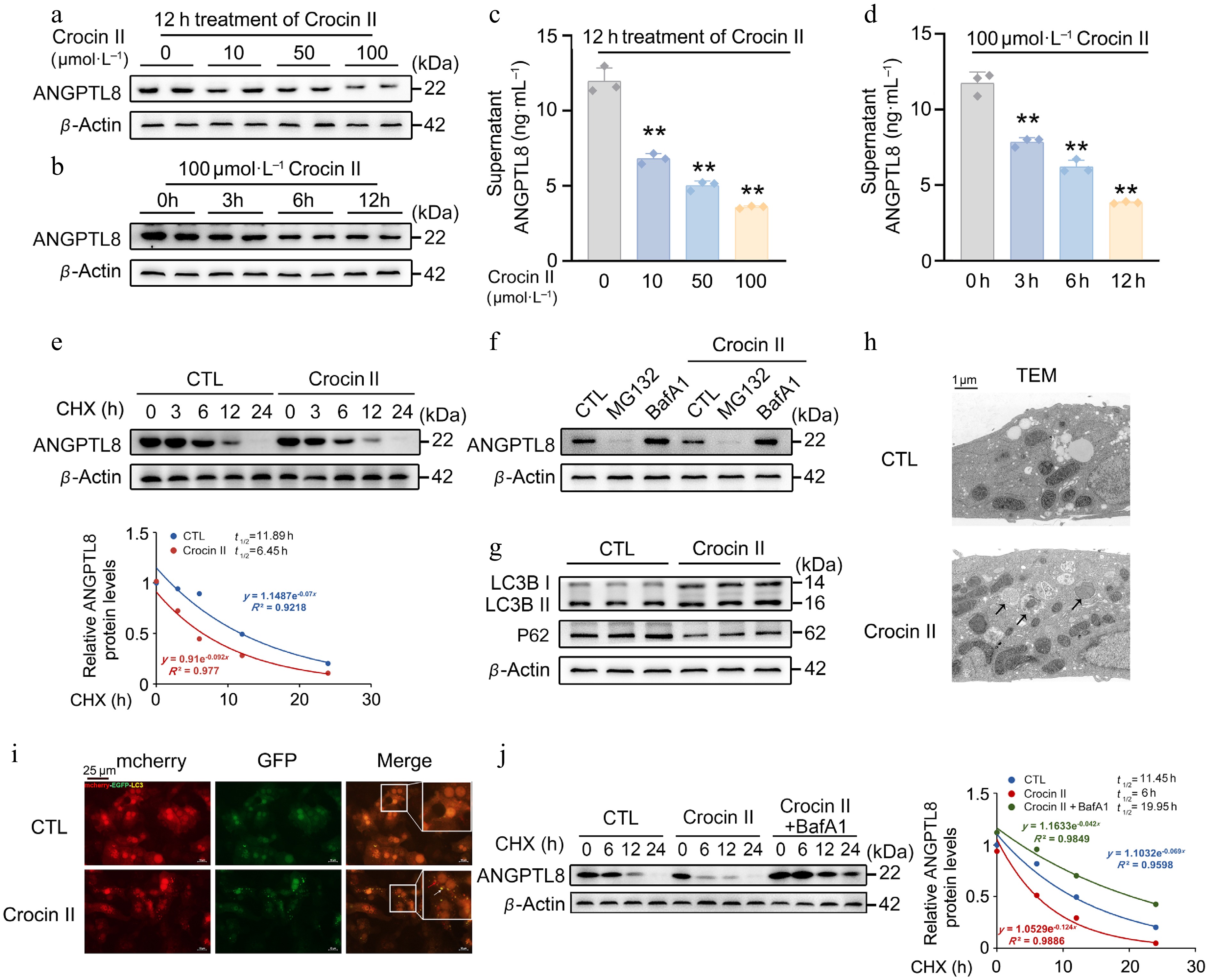 Crocin II promotes the degradation of ANGPTL8 protein through the autophagosome-lysosome pathway. (a) The protein levels of ANGPTL8 in mouse PHs treated with different concentrations of Crocin II for 12 h. (b) The protein levels of ANGPTL8 in mouse PHs treated with 100 μmol·L−1 Crocin II for different time points. (c) Supernatant ANGPTL8 levels in mouse PHs treated with indicated different concentrations of Crocin II for 12 h. (d) Supernatant ANGPTL8 levels in mouse PHs treated with 100 μmol·L−1 Crocin II for different durations. (e) CHX chase assay to assess Crocin II-induced changes in ANGPTL8 protein stability in mouse PHs. CTL, control. (f) Western blot analysis of ANGPTL8 protein degradation pathways. (g) The protein levels of LC3B-II/I and P62 in mouse PHs treated with 100 μmol·L−1 Crocin II. (h) TEM analysis (arrows indicate autophagosomes). (i) mCherry-eGFP-LC3 fluorescence images (white arrows indicate autophagosomes, and the red arrows indicate autolysosomes), scale bar = 25 μm. (j) The protein levels of ANGPTL8 in mouse PHs treated with Crocin II or combined with BafA1. ** P < 0.01 vs 0 μmol·L−1 Crocin II group, one-way ANOVA followed by Bonferroni's post hoc test. Data are presented as the mean ± SEM, n = 3.