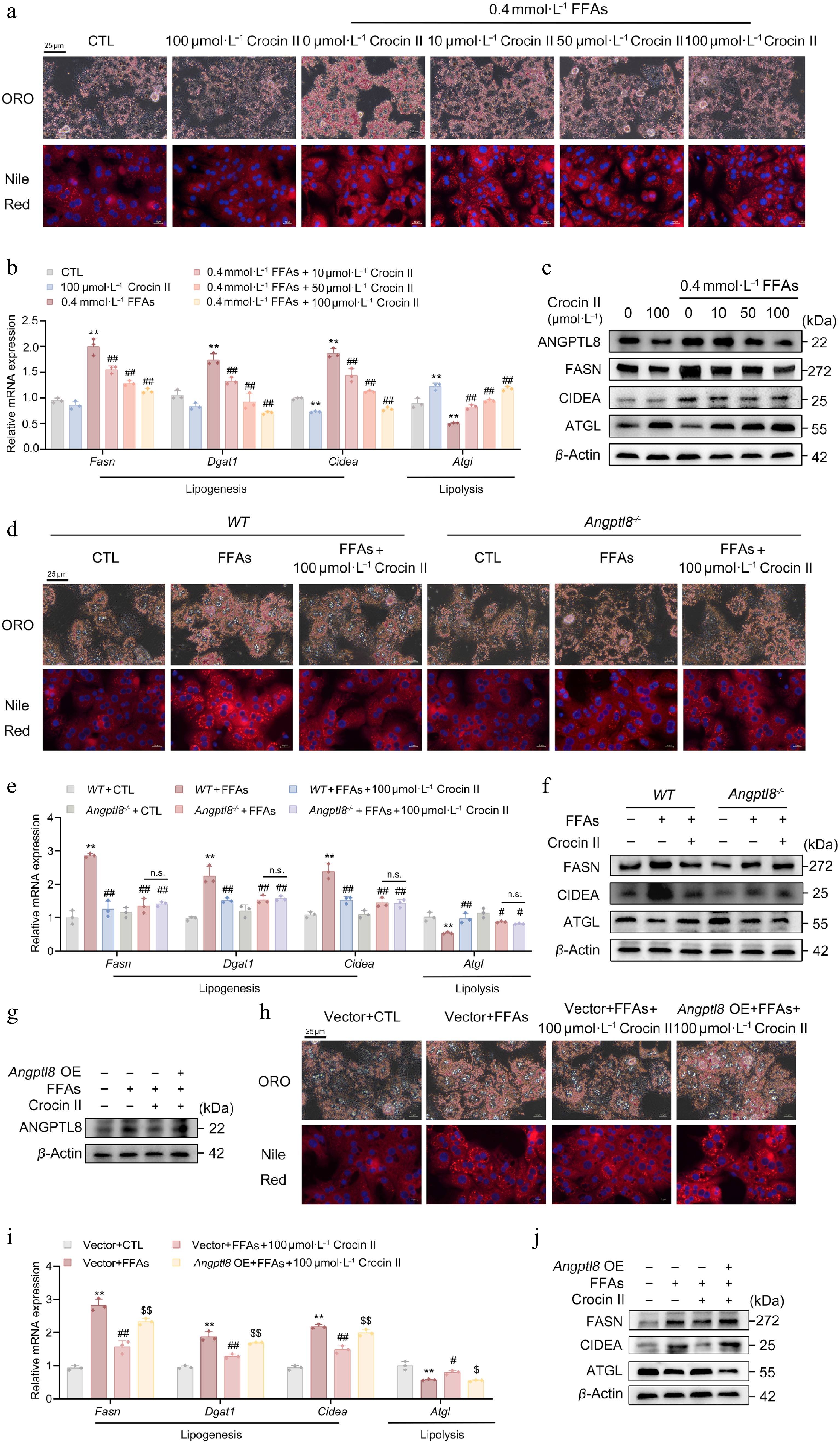 ANGPTL8 mediates the lipid-lowering effects of Crocin II in mouse PHs. (a)–(c) Mouse PHs were pre-incubated with 100 μmol·L−1 Crocin II for 2 h, and then treated with 100 μmol·L−1 Crocin II and 0.4 mmol·L−1 FFAs for 24 h. (a) ORO staining and Nile Red staining. Scale bar = 25 μm. (b) The relative mRNA expression of Fasn, Dgat1, Cidea and Atgl. (c) The protein levels of ANGPTL8, FASN, CIDEA and ATGL. ** P < 0.01 vs CTL group, # P < 0.05, ## P < 0.01 vs 0.4 mmol·L−1 FFAs group, one-way ANOVA followed by Bonferroni's post hoc test. (d)–(f) Mouse PHs isolated from WT and Angptl8−/− mice were pre-incubated with 100 μmol·L−1 Crocin II for 2 h, and then treated with 100 μmol·L−1 Crocin II and 0.4 mM FFAs for 24 h. (d) ORO staining and Nile Red staining. Scale bar = 25 μm. (e) The relative mRNA expression of Fasn, Dgat1, Cidea and Atgl. (f) The protein levels of FASN, CIDEA and ATGL. n.s., no significance, ** P < 0.01 vs WT + CTL group, # P < 0.05 and ## P < 0.01 vs WT + FFAs group, one-way ANOVA followed by Bonferroni's post hoc test. (g)–(j) Mouse PHs were transfected with either Angptl8-overexpressing plasmid or empty vector (pcDNA3.0). 24 h later, cells were pre-incubated with 100 μmol·L−1 Crocin II for 2 h, and then treated with 100 μmol·L−1 Crocin II and 0.4 mmol·L−1 FFAs for 24 h. (g) The protein levels of ANGPTL8. (h) ORO staining and Nile Red staining. Scale bar = 25 μm. (i) The relative mRNA expression of Fasn, Dgat1, Cidea and Atgl. (j) The protein levels of FASN, CIDEA and ATGL. A8oe, Angptl8 overexpression. * P < 0.05 and ** P < 0.01 vs vector + CTL group, # P < 0.05 and ## P < 0.01 vs vector + FFAs group, or + FFAs group, $^{\$} $ P < 0.05, and $^{{\$}{\$}} $ P < 0.01 vs vector + FFAs + 100 μmol·L−1 Crocin II group, one-way ANOVA followed by Bonferroni's post hoc test. Data are presented as the mean ± SEM, n = 3.