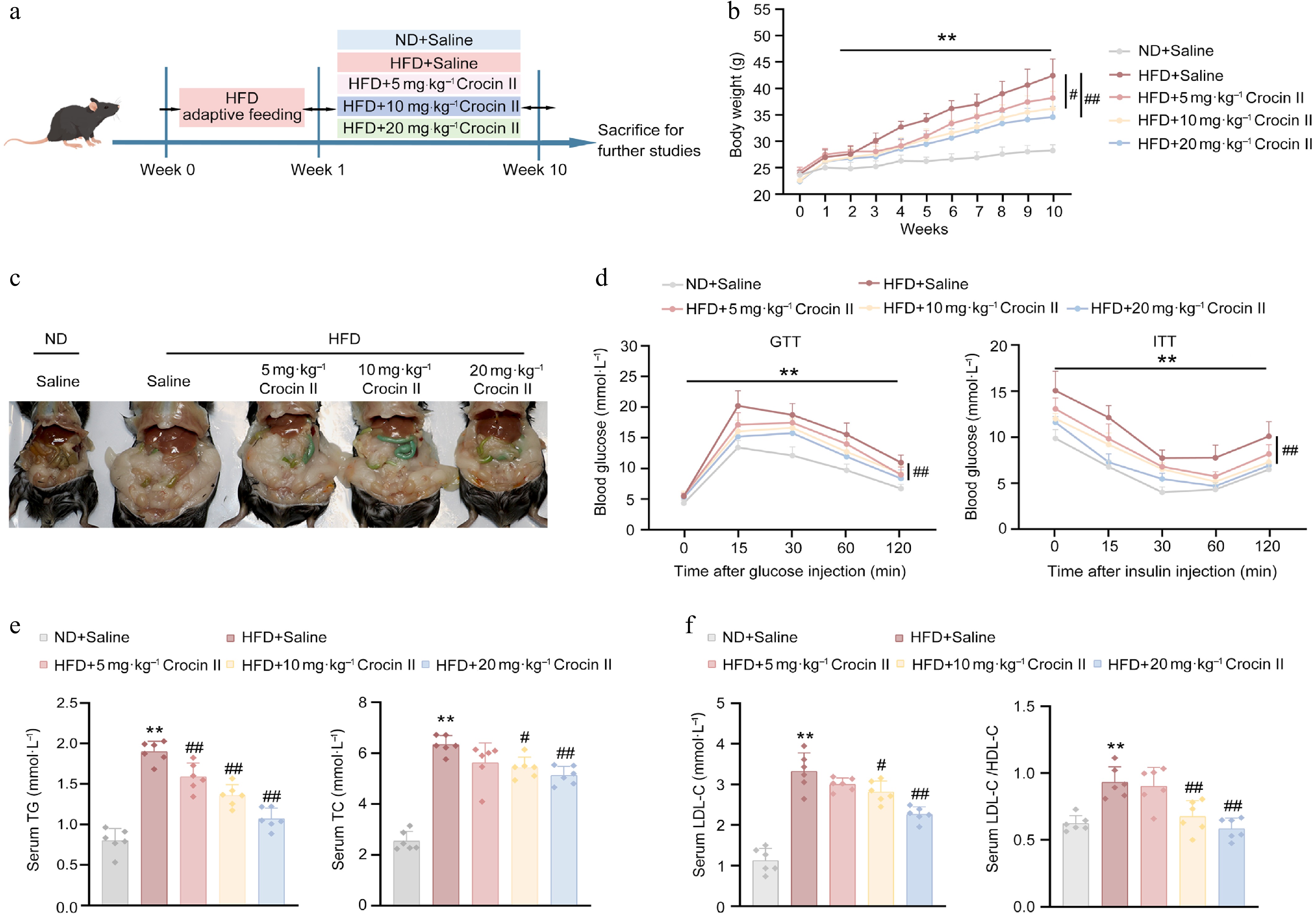 • To further confirm the beneficial effects of Crocin II on hepatic steatosis in vivo, mice were fed with an HFD and treated with different doses of Crocin II for 10 weeks (Fig. 4a). HFD feeding significantly reduced food intake in mice, whereas Crocin II administration did not alter either food intake or water drinking across all experimental mice (Supplementary Fig. S5a). Notably, high-dose administration of Crocin II markedly reduced the body weight of HFD-fed mice by 18.58% (Fig. 4b). Morphologically, Crocin II-treated mice exhibited alleviated HFD-induced hepatic steatosis and reduced epididymal fat accumulation (Fig. 4c). GTT and ITT demonstrated that Crocin II dose-dependently improved glucose intolerance and insulin resistance in HFD-fed mice (Fig. 4d; Supplementary Fig. S5b). Biochemically, Crocin II normalized serum lipid profiles by reducing the levels of TG, TC, and LDL-C in HFD-fed mice (Fig. 4e and f). Consistently, the detrimental LDL-C/HDL-C ratio was significantly lowered by Crocin II treatment (Fig. 4f).