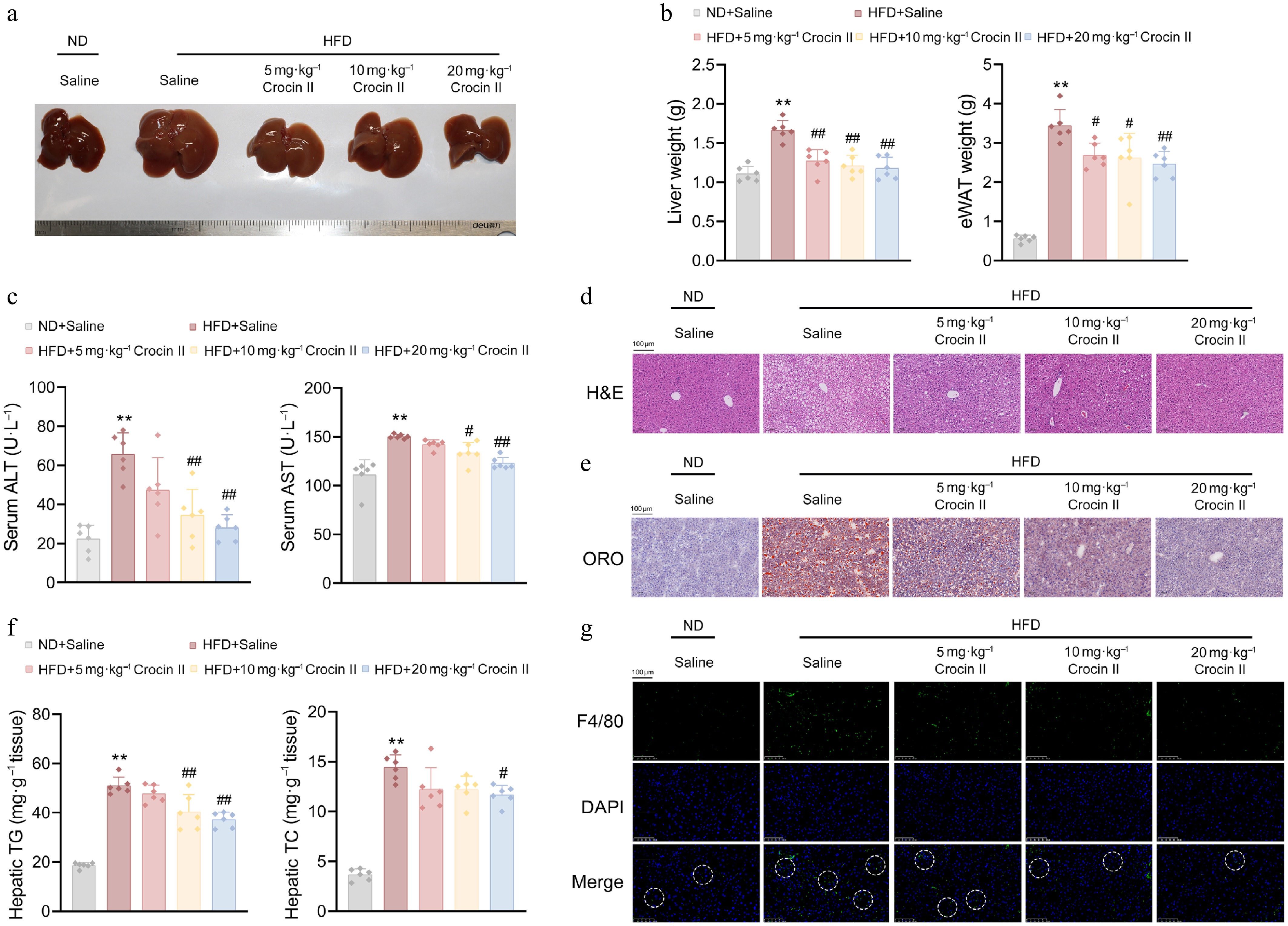 Crocin II ameliorates HFD-induced hepatic steatosis in mice. (a) Image of liver morphology. (b) Liver and eWAT weights. (c) Serum ALT and AST levels. (d) Representative images of livers by H&E staining. Scale bar = 100 μm. (e) Representative images of livers by Oil Red O staining. Scale bar = 100 μm. (f) Liver TG and TC contents. (g) Representative images showed F4/80 staining of liver tissues. Scale bar = 100 μm. ** P < 0.01 vs ND + Saline group, # P < 0.05 and ## P < 0.01 vs HFD + Saline group, one-way ANOVA followed by Bonferroni's post hoc test. Data are presented as the mean ± SEM, n = 6.