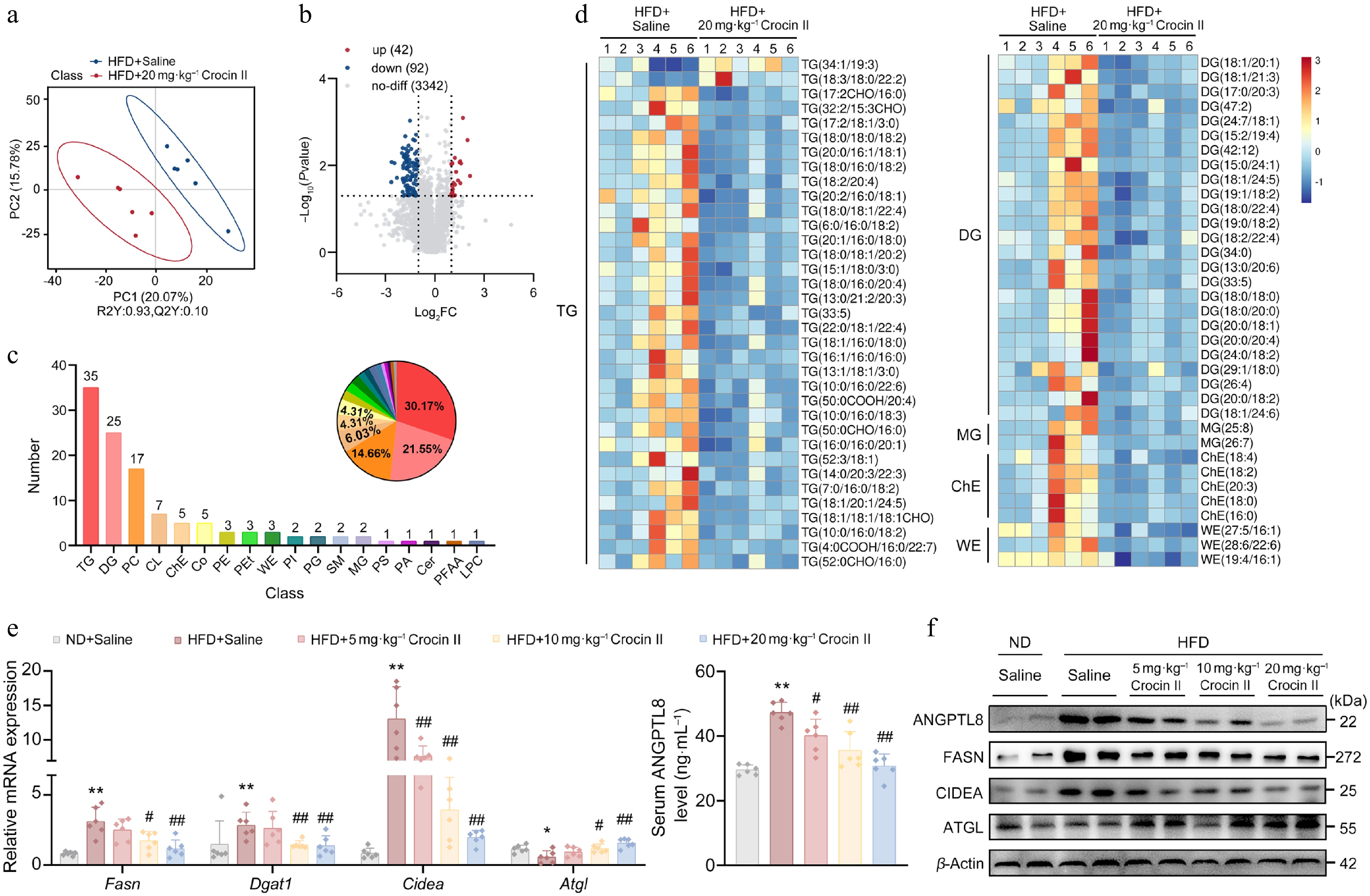 Crocin II reprograms hepatic lipidomic landscape in HFD-induced MASLD mice. (a) PLS-DA score of liver lipidome in mice from HFD + saline group and HFD + 20 mg·kg−1 Crocin II group. (b) Volcano plot. (c) Statistical plot of differential lipid categories. (d) Heatmap of differential lipids. (e) The relative mRNA expression of Fasn, Dgat1, and Cidea (left). The supernatant Angptl8 levels in mouse serum detected (right). (f) The protein levels of ANGPTL8, FASN, DGAT1 and CIDEA. ** P < 0.01 vs ND + saline group, # P < 0.05 and ## P < 0.01 vs HFD + saline group, one-way ANOVA followed by Bonferroni's post hoc test. Data are presented as the mean ± SEM, n = 6.