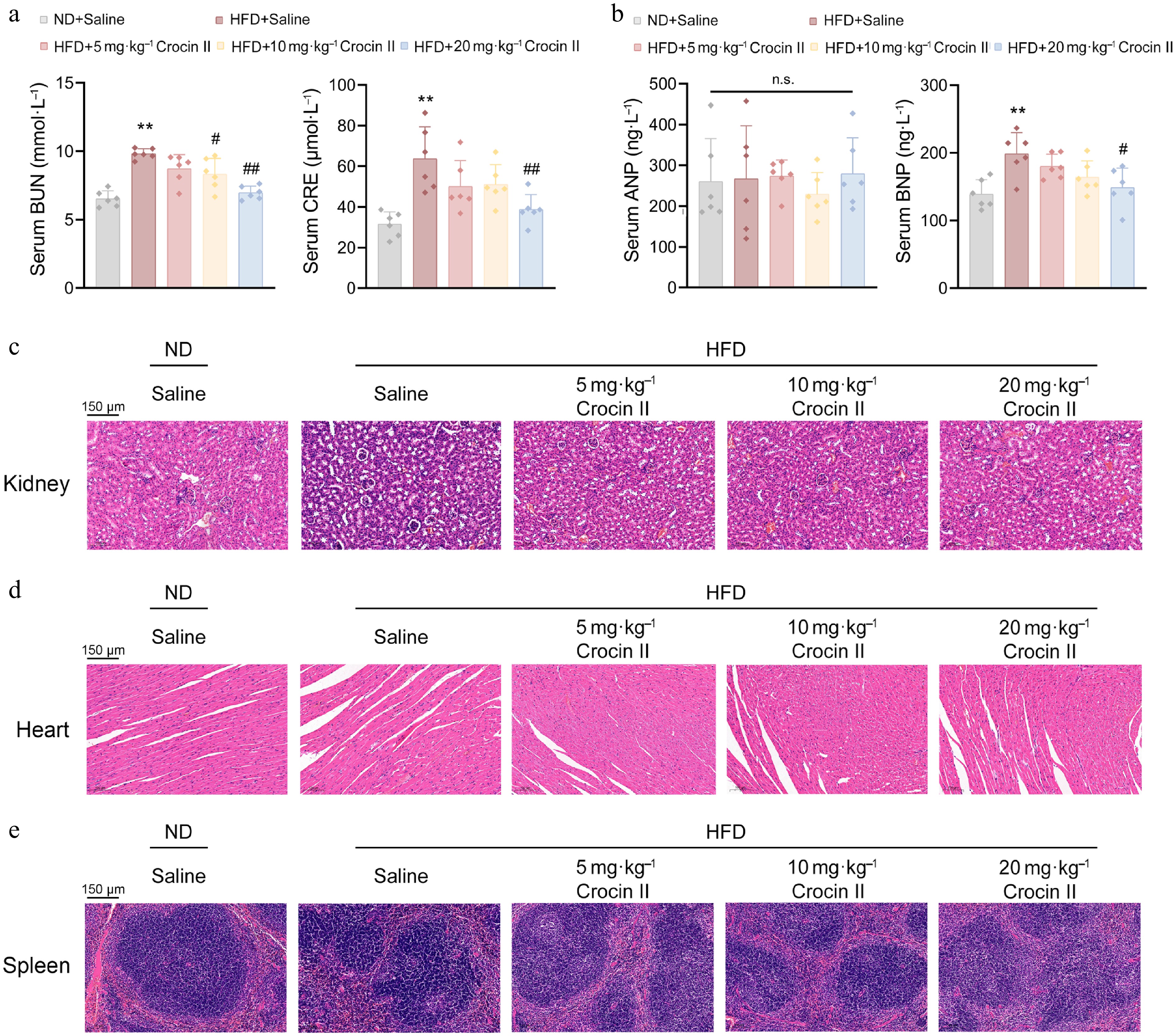 Crocin II exerts in vivo organ safety. (a) The serum levels of BUN and CRE. (b) The serum levels of ANP and BNP. (c) Representative images of the kidney by H&E staining. (d) Representative images of the heart by H&E staining analysis. (d) Representative images of the spleen by H&E staining analysis. n.s., no significance, ** P < 0.01 vs ND + saline group, # P < 0.05 and ## P < 0.01 vs HFD + saline group, one-way ANOVA followed by Bonferroni's post hoc test.Data are presented as the mean ± SEM, n = 6.
