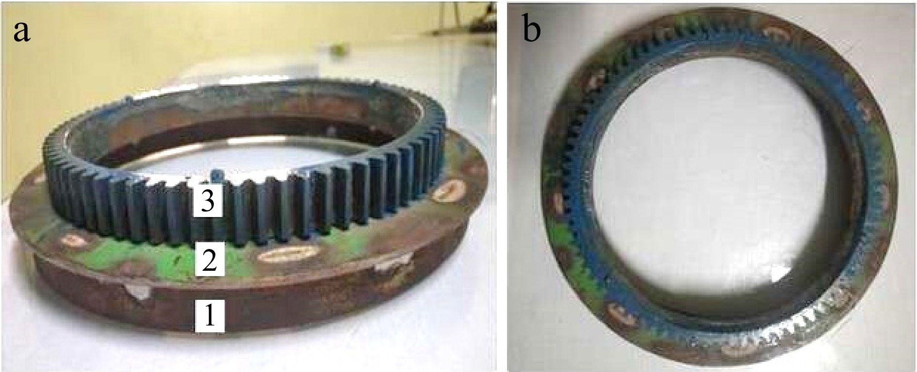 (a) Front view of upper unit: 1. circular flat; 2. circular plate; 3. ring gear. (b) Top view of the upper unit.