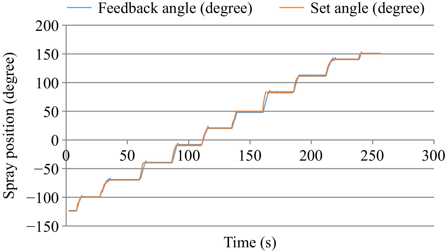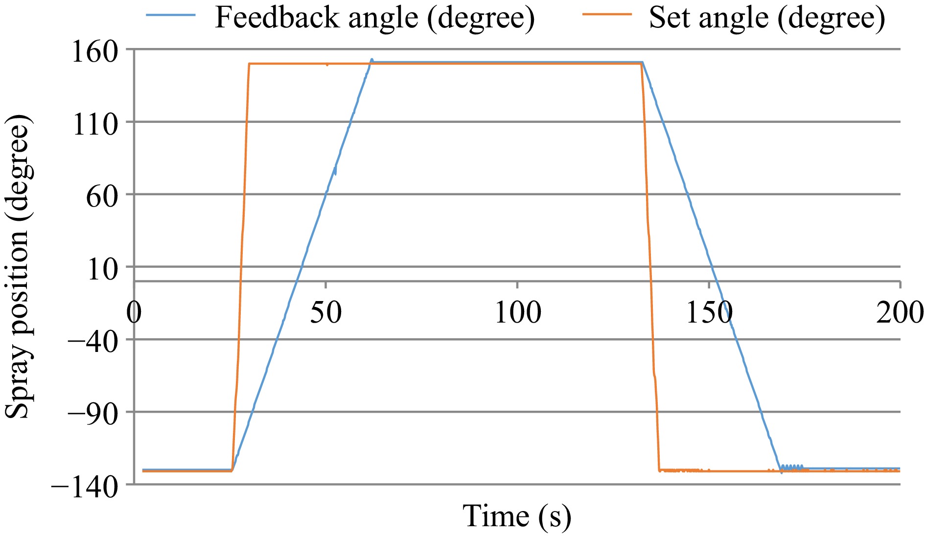 The comparison between the set position and the current position of the spray delivery pipe is shown in Fig. 12. It was noted that the current position of the spray delivery pipe closely aligns with the set position, fluctuating within the range of 0° to 2°. This suggests that the developed system is highly accurate. Moreover, it was observed that the system operates with remarkable precision, especially beyond 20°.