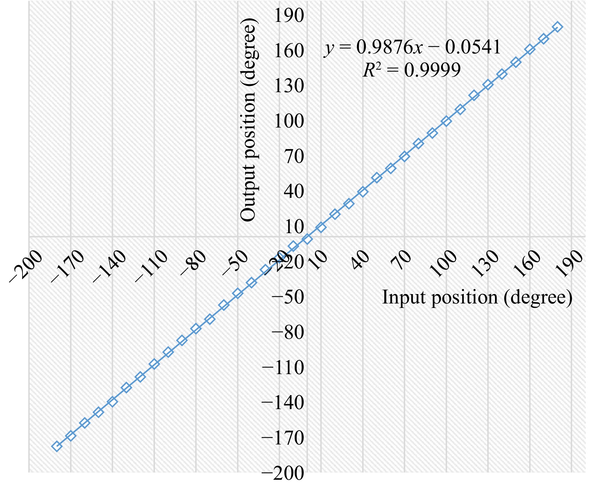 Figure 10 illustrates the step input positioning of the spray delivery pipe, showcasing the time taken for the pipe to complete its rotation by the set position determined by the lever. The assessment involved adjusting the position in increments of 30 degrees within a range of −180 to +180 degrees using the lever. It was observed that each step input took approximately 2 s to execute. Upon initiating the lever's rotation, there was a 1-s delay before the spray delivery pipe began its rotation. On average, the pipe took 2.31 s to complete a 30-degree rotation once in motion. The delay or response time between the set position of the lever and the embedded system's reaction time was measured at 1.33 s. Figure 11 visually depicts a direct relationship: as the set angle of the spray delivery pipe increased through lever adjustment, the position of the spray delivery pipe was correspondingly adjusted.