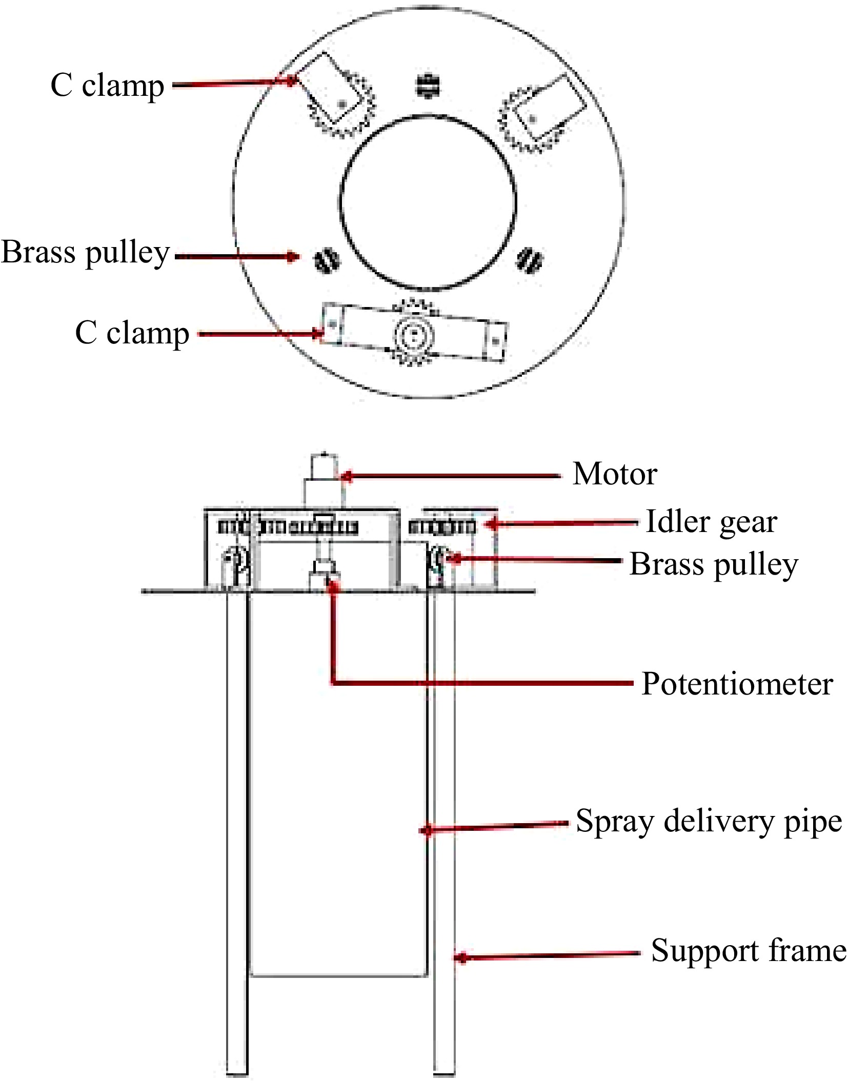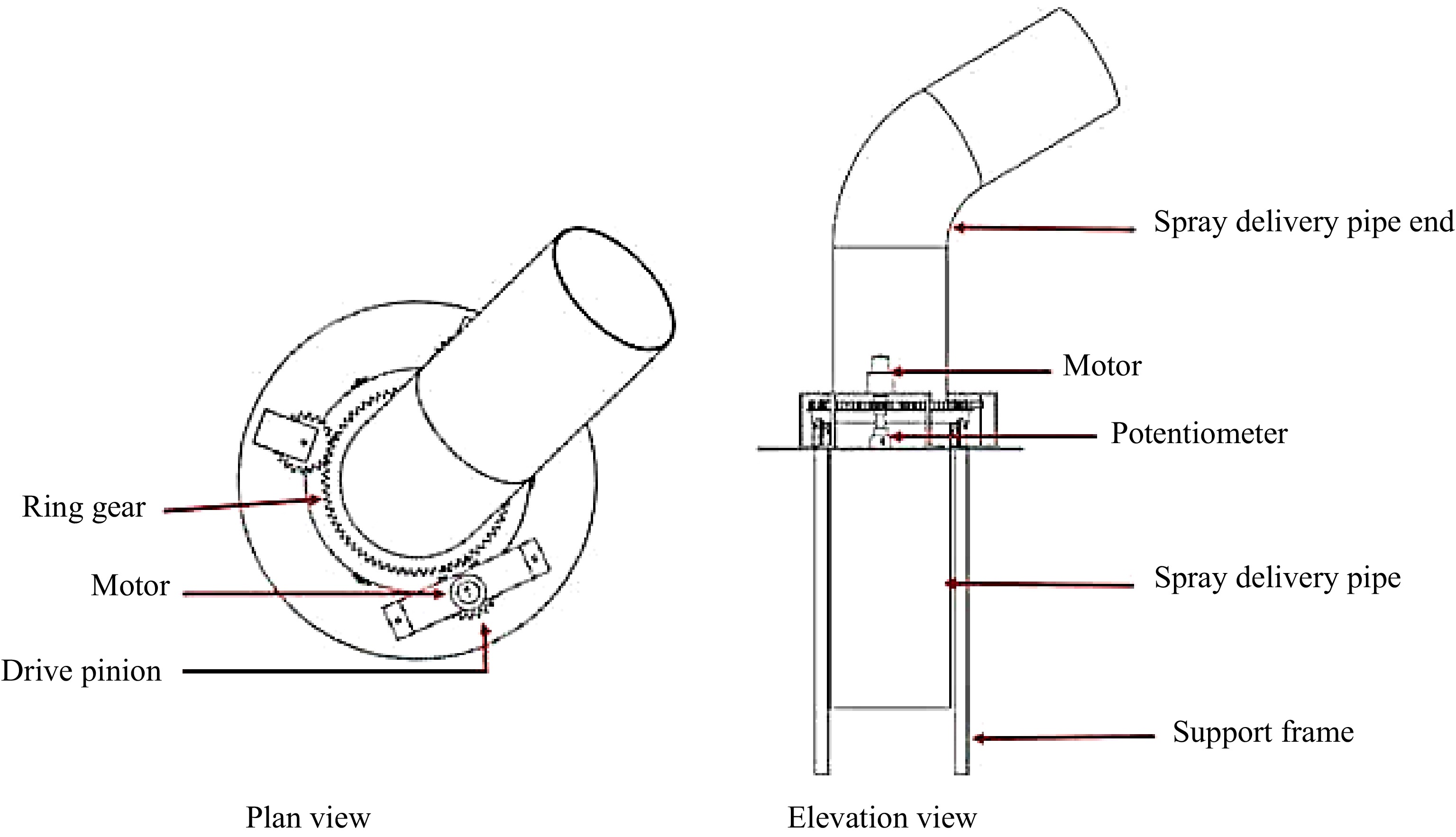 Orchard growers are increasingly adopting air blast sprayers due to their significant advantages over traditional spraying methods. These sprayers offer improved spray performance, cost efficiency, uniform distribution, and decreased labor requirements[1−3]. During the flowering season, rainfall and overcast conditions create a conducive environment for the proliferation of diseases and insect pests. These aggressive pests and diseases pose a considerable threat, potentially resulting in the complete loss of the crop[4−7]. Pradeep et al.[8] highlighted that when mango panicles are affected by pests and diseases, the yield of mangoes may decline by 50%−80%. Consequently, it underscores the importance of spraying to mitigate damage from insects and diseases, thereby controlling their detrimental impact on crop yields. Multiple experiments conducted across different crops using modern techniques have provided evidence that the discharge of chemical substances leads to environmental pollution. Van den Berg et al.[9] illustrated that between 20% to 30% of the material applied is lost to the air, comprising up to 50% of the total applied material. The extent of atmospheric loss, as indicated by Cross et al.[10], depends on various factors, such as the chemical properties of the applied material, atmospheric conditions, and the spraying technologies employed. A variety of technologies[11−14] have been developed for controlling DC motors. Mondal et al.[15] introduced a microcontroller-based embedded system for DC motor control, employing a closed-loop approach. Their system established a continuous closed-loop circuit by harnessing back electromotive force (EMF) generated through the tachogenerator. Gohiya et al.[16] demonstrated a DC motor driving system using an embedded system for a mobile robot. However, a significant limitation of this system is the relatively low processing speed of the processor. The existing air blast sprayer setup necessitates dual operators: one handling the tractor and another stationed at the rear of the sprayer. The second operator is responsible for adjusting the position and direction of the delivery pipe while in operation. However, this arrangement exposes the operator to significant vibration, jerking, and potential pesticide exposure from the polluted air generated during spraying[17,18]. Operator exposure within the pesticide spraying area can have a significant impact on health, as highlighted by Wong et al.[19]. Additionally, workplace vibrations can adversely affect the human body, leading to health issues such as muscle strain, back pain, and spine degeneration[20−22]. The current air blast sprayer presents several challenges, including operator-experienced vibrations and serious hazards for the sprayer operator. Therefore, there is a necessity for modification in the existing system wherein the tractor operator can also manage the sprayer. Eliminating the need for a second operator in the air blast sprayer has driven the design and development of a microcontroller-based automation system to control the spray delivery pipe using a DC motor. The primary goal of this research paper is to devise a mechanism and a microcontroller-based embedded system to rotate the delivery pipe of the air blast sprayer, enabling precise spraying on the target plant.