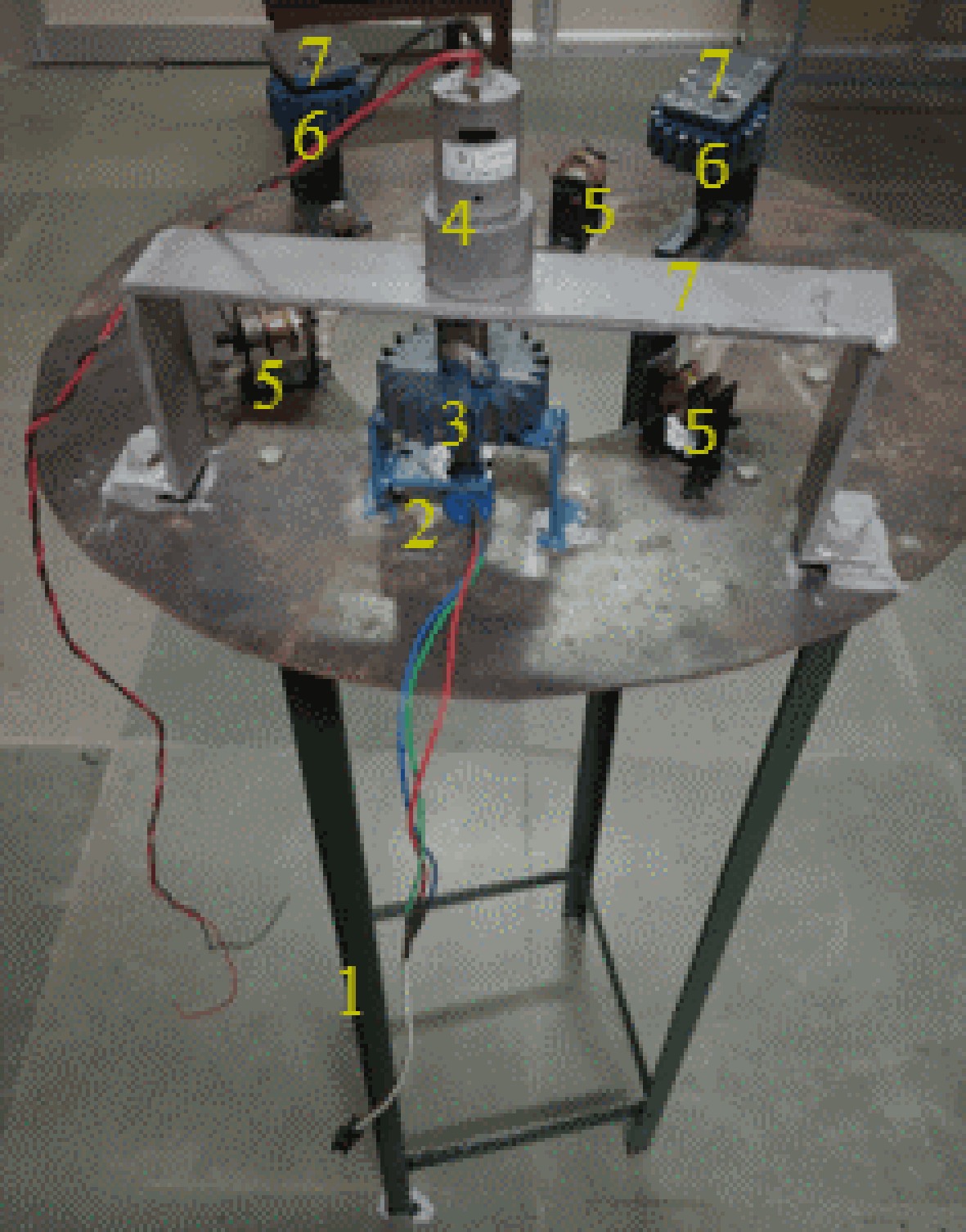 Schematic view of lower unit: 1. four leg stand, 2. position sensor, 3. pinion gear, 4. motor, 5. brass pulley, 6. idler gear, 7. C clamp.
