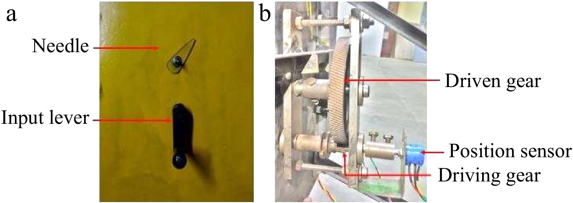 The signal generator consists of several components: a lever, a gear assembly comprised of both driven and driving gears, and a position sensor (R1). The position sensor (R1) is connected to the lever through a gear assembly, which incorporates an 8.54 gear reduction ratio. The lever is utilized to adjust the desired position of the spray delivery pipe. These components are installed on a rectangular plate, as depicted in Fig. 4.