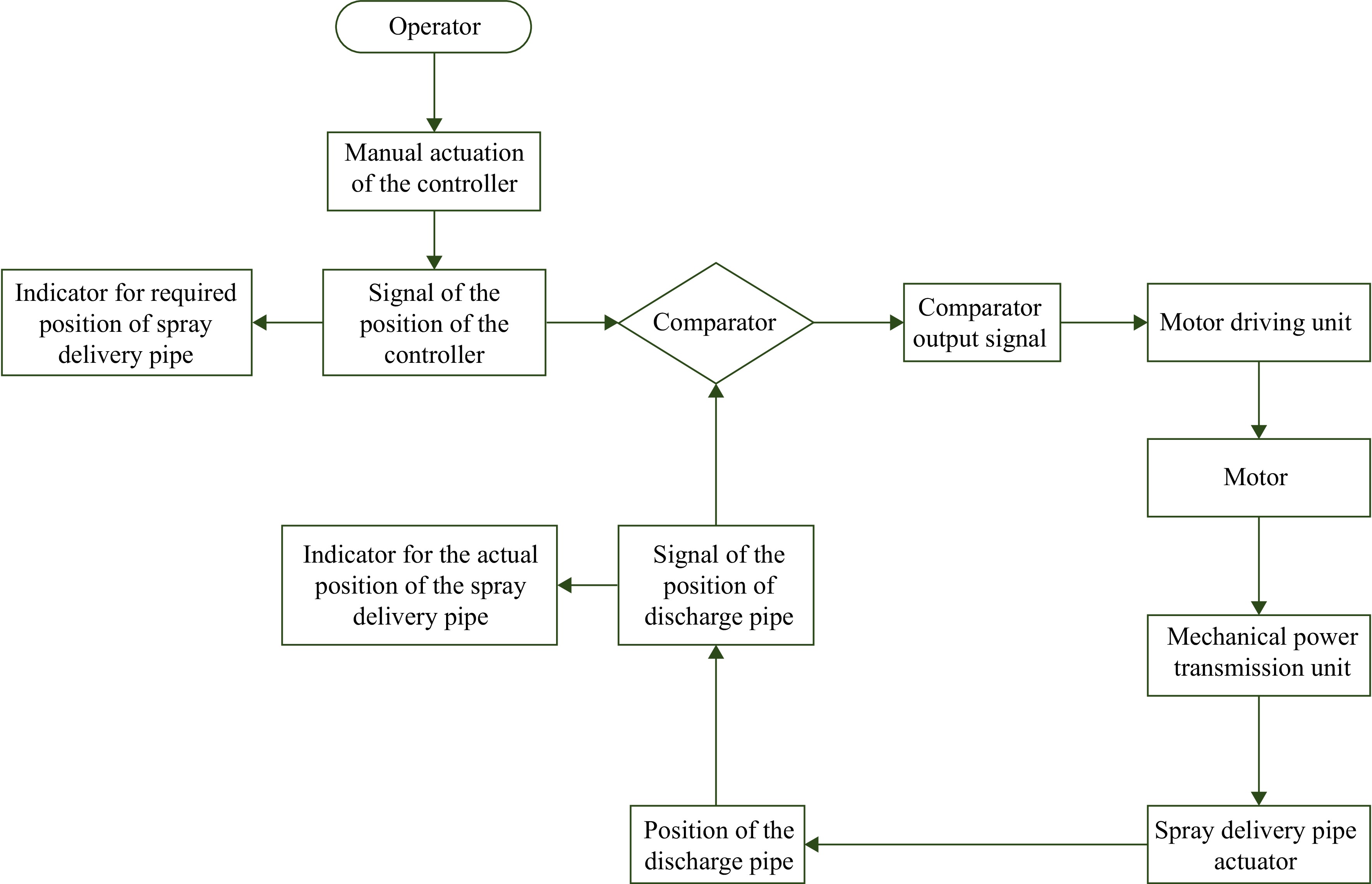 The embedded system collects input signals from two distinct sources: firstly, from the signal generator, which indicates the desired position of the spray delivery pipe; and secondly, from the mechanical position indicator, which relays feedback signals from the controller regarding the current position of the pipe. A microcontroller, acts as a comparator, within the embedded system analyses and compares these input signals. Based on this comparison, the output of the comparator can be either negative or positive. A negative signal instructs the motor to rotate the pipe anticlockwise, while a positive signal prompts clockwise rotation through the interlocking mechanism of the ring and pinion gears. With this setup, the need for a secondary operator to manually adjust the spray delivery pipe is eliminated. Instead, the system operates autonomously, controlling the positioning of the pipe based on the signals it receives and processes within the embedded system. This automation streamlines the process, enhancing efficiency and reducing the potential for human error.