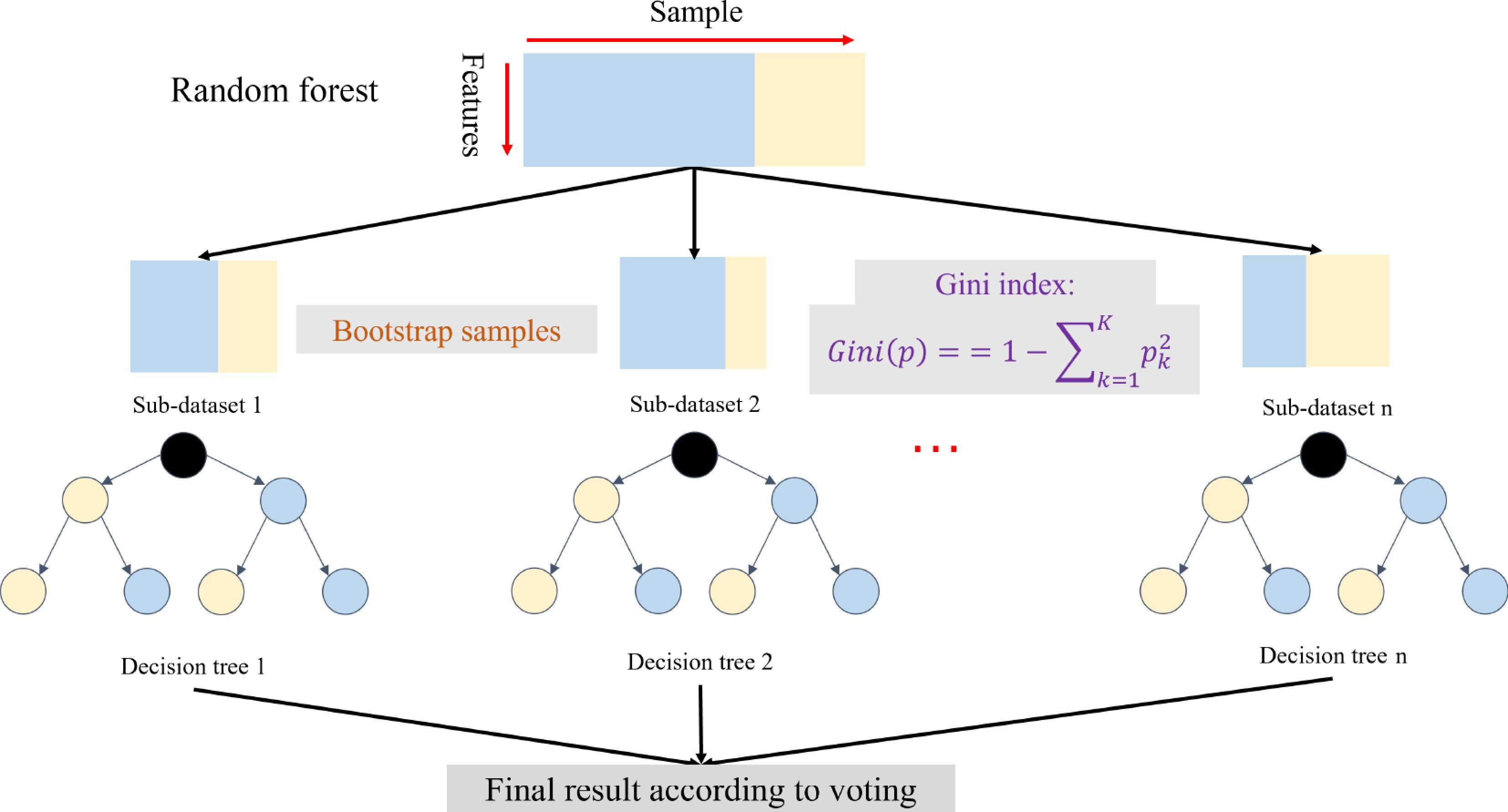Random Forest (RF) is a typical bagging ML method (Fig. 2)[51]. Using this method, M training samples are drawn from the N original sample set via the bootstrap method per round. In the training set, some samples may be drawn multiple times, while some samples may not be drawn even once. K rounds of extraction are carried out to obtain K training sets that are independent of each other. K training sets are constructed using different types of decision tree algorithms for classification or regression. For example, each weak learner could be constructed by classification and regression tree[52] using the Gini index: $ \mathit{Gini}\left(p\right)=1-\sum_{k=1}^Kp_k^2 $.