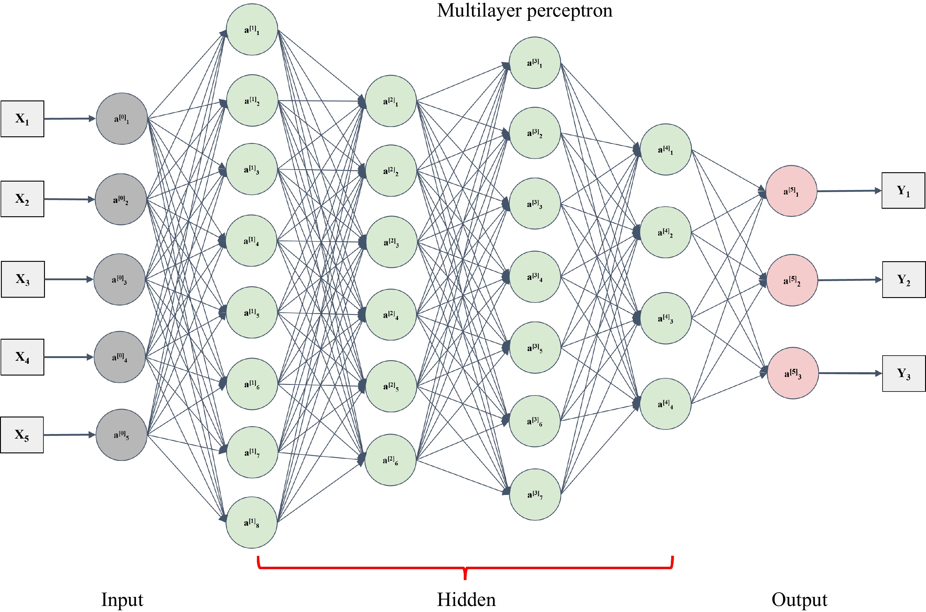 MLP is a deep neural network mechanism and technology. The simplest MLP is a neural network with a three-layered structure containing an input layer, a hidden layer, and an output layer (Fig. 4)[62]. Multiple hidden layers can be added to the network. The mathematical expressions are as follows: