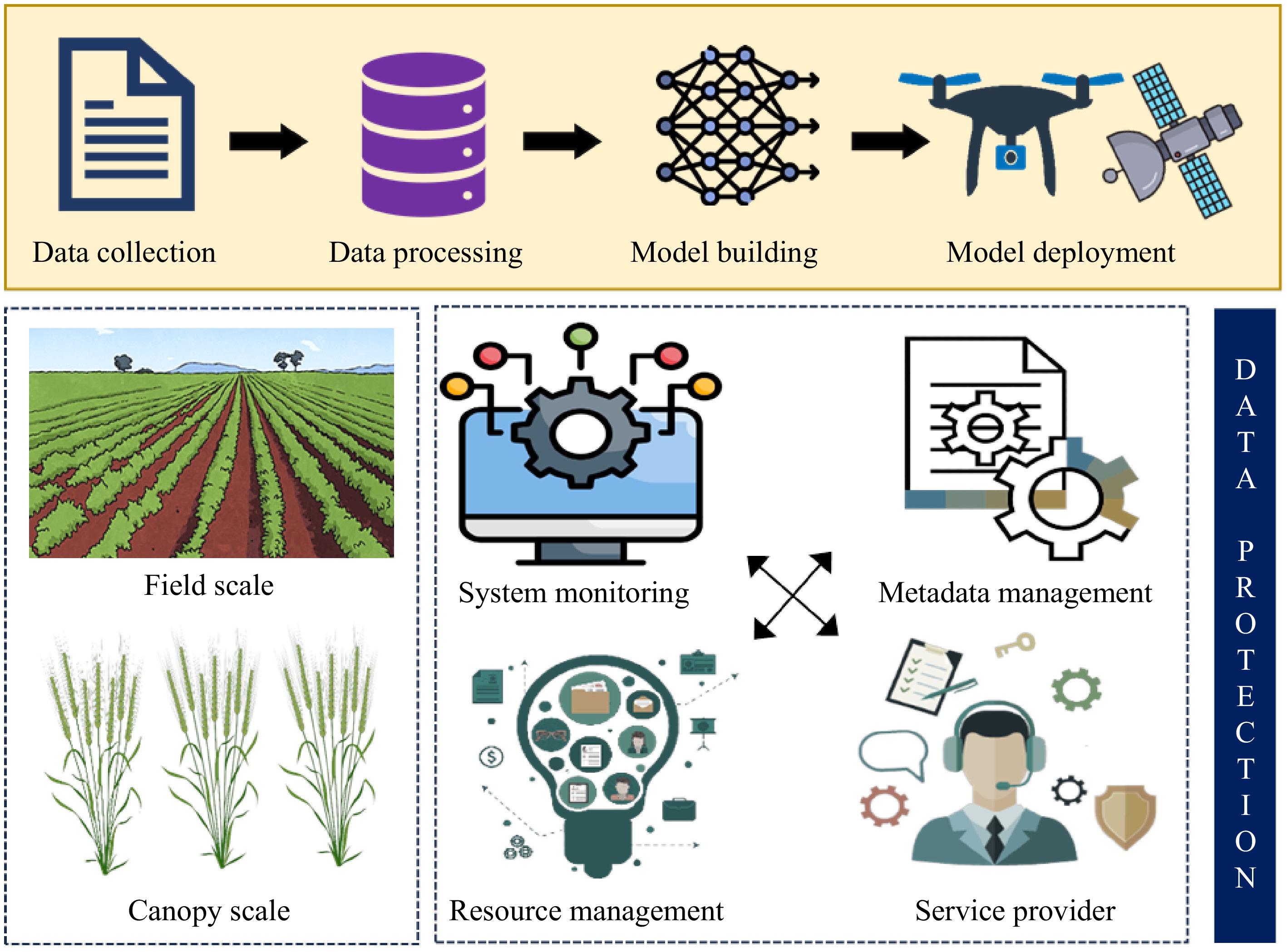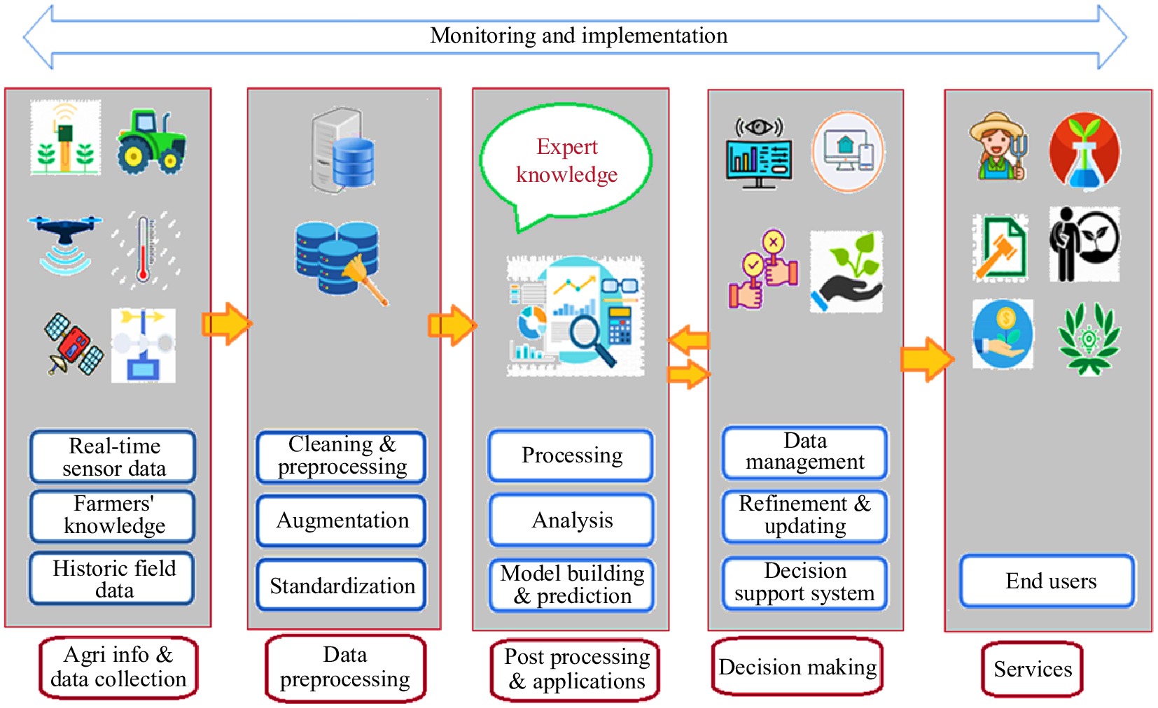 An overview of the hierarchy of digital agricultural systems from data collection in the field to decision-making and services (from left to right), modified from Amiri-Zarandi et al.[26].