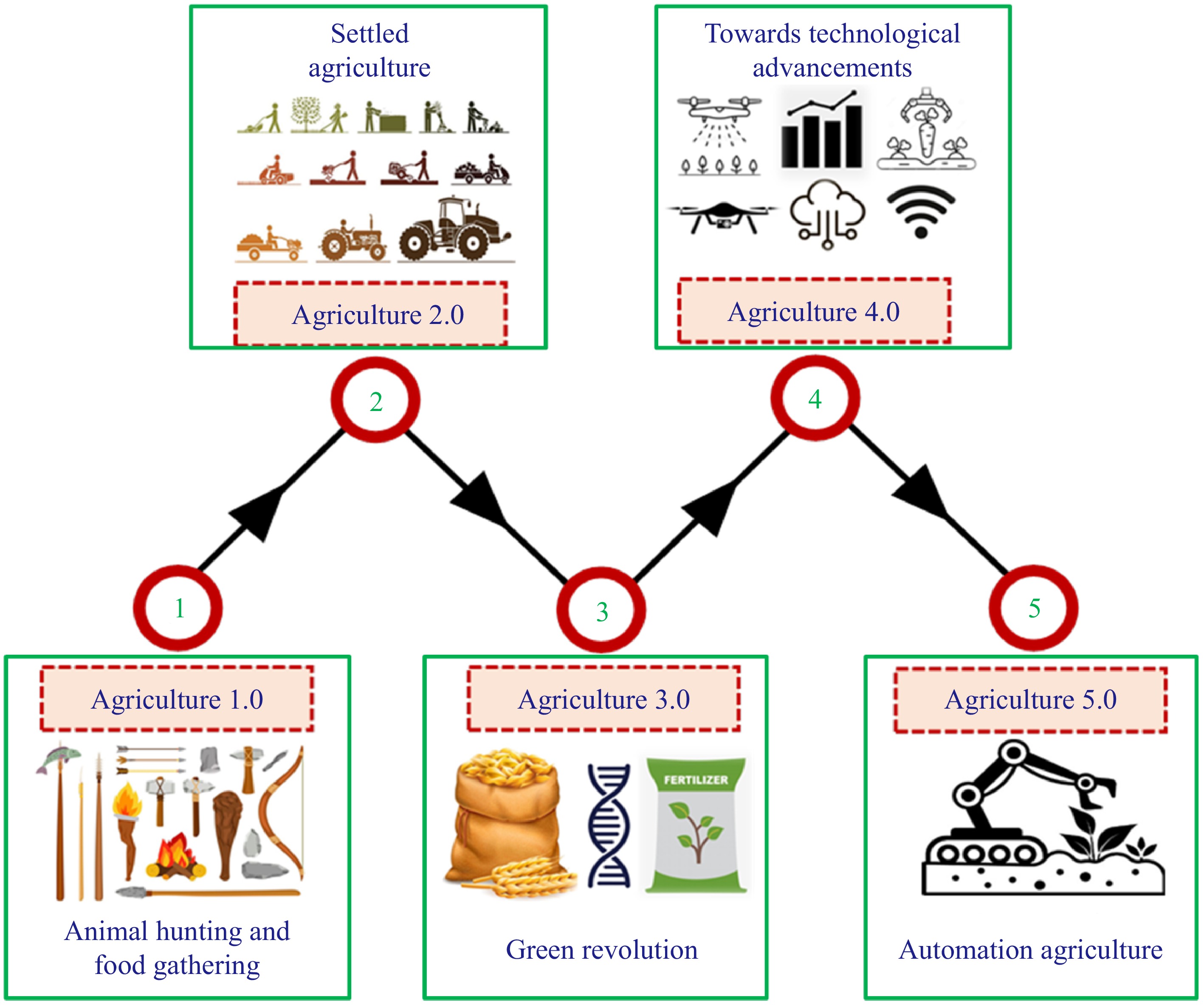 A pictorial overview of agricultural transformation from manual to automated operation from Agriculture 1.0 to 5.0.