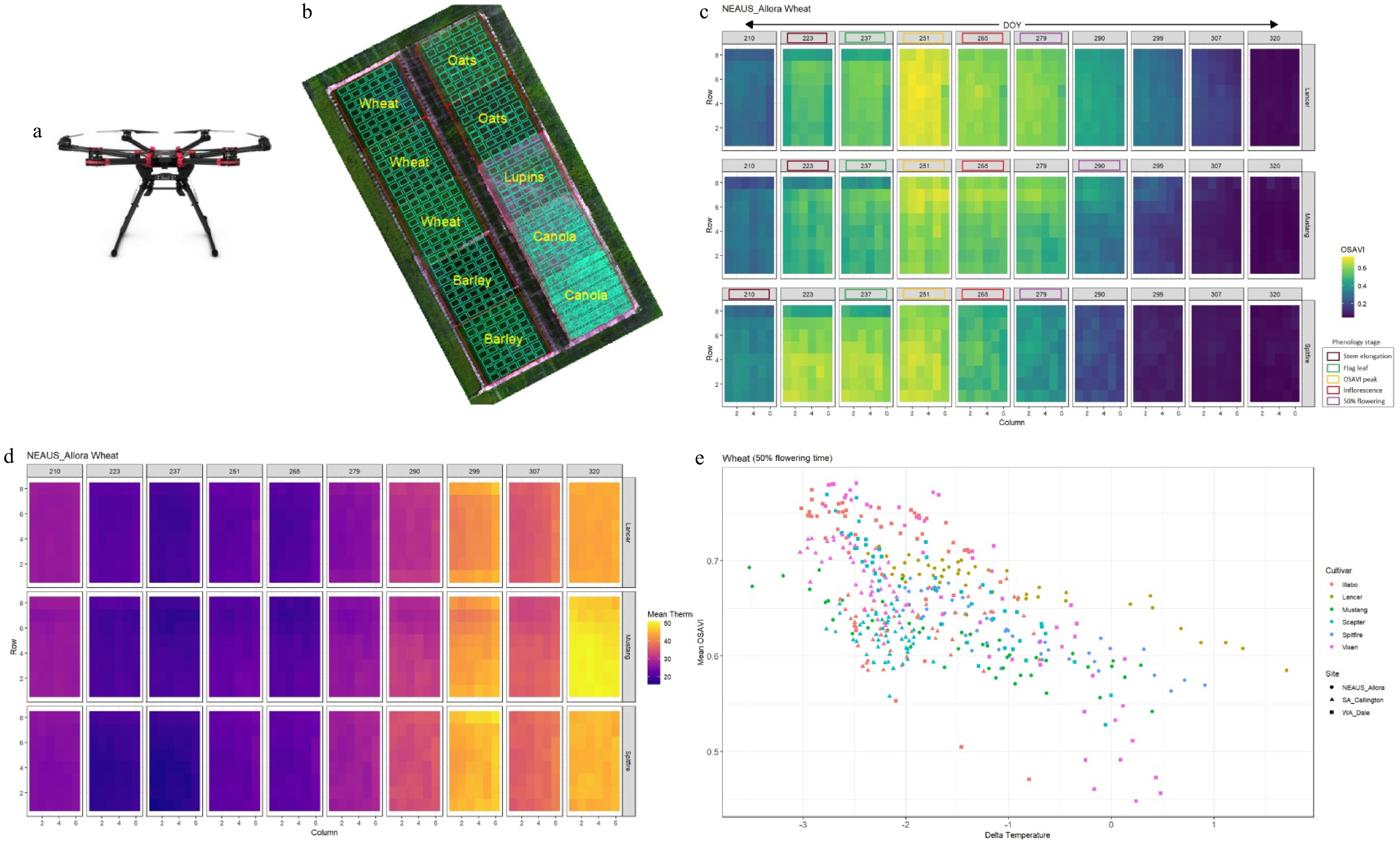 (a) A UAV platform (DJI Matrice Hexacopter). (b) A composite five-band (blue, green, red, near-infrared, and longwave thermal infrared) multispectral image of a large multicropping field in Australia captured using the UAV. Each plot (60 m × 60 m) represents each crop and its different cultivars. The green rectangular boxes within each plot represent the gridded (6 m × 10 m) profile of each crop and/or cultivar to determine spatial variability within each plot (60 m × 60 m). (c) The 'Xtractori' outcome derived from the UAV-multispectral images over the season shows spatial and temporal variations (across the season on the day of year (DOY)) in crop greenness and vigour based on an optimized soil adjusted vegetation index (OSAVI) among different cultivars (Lancer, Mustang, and Spitfire) of wheat in a northeastern Australian field (NEAUS). A number of vegetation and soil indices, including land surface and canopy temperatures, can be extracted from the 'Xtractori' program. Among others, OSAVI was used as an example case. The colour scale of the OSAVI (right side) indicates a value ranging between 0 and 1. When OSAVI > 0.5 indicates adequate crop greenness and vigour, an OSAVI < 0.5 indicates relatively low greenness. Phenology observations of the cultivars (stem elongation, flag leaf, 50% flowering, etc.) were mapped using different colours on the spatiotemporal gridded OSAVI profile to determine the relationships between phonological changes and changes in greenness and vigour of the culivars/crop across the season (DOYwise). (d) The 'Xtractori' program was effectively used on seasonal UAV-multispectral images to determine spatiotemporal variations (DOYwise) in canopy temperature dynamics (mean thermal) among different cultivars of wheat in the NEAUS field. (e) Integrated UAV-multispectral imagery and the 'Xtractori' program-derived OSAVI and Delta temperature (air temperature, canopy temperature) was closely correlated for different wheat cultivars at 50% flowering stage across different sites in Australia (NEAUS, South Australia (SA), and Western Australia (WA)) (data source: Das et al.[91]).