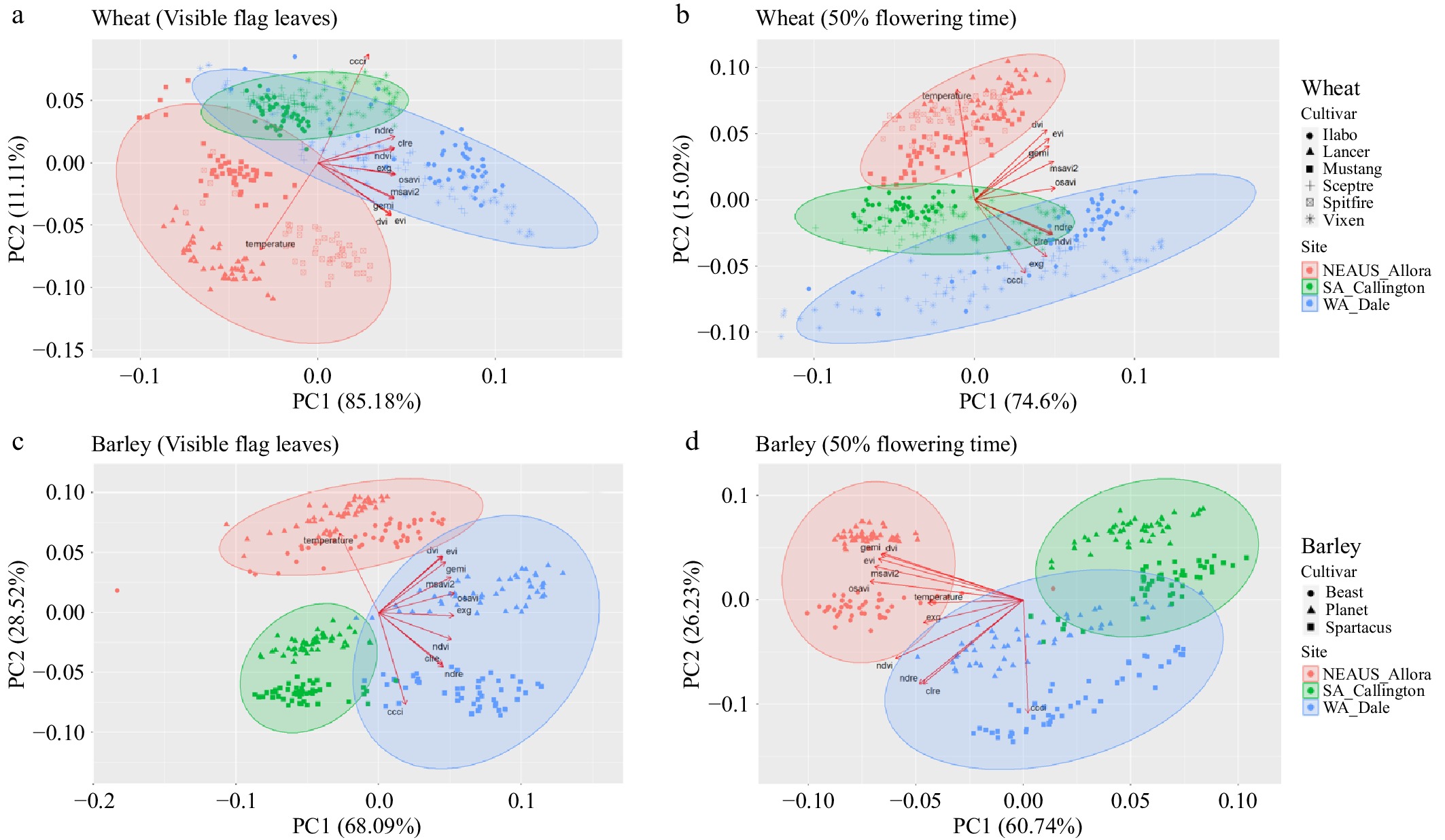 Principal component analysis and clustering methods were applied to the UAV-multispectral images and the 'Xtractori'-derived multiple crop physiological and morphological traits, such as canopy temperature, canopy chlorophyll content index (ccci), chlorophyll rededge index (clre), normalized difference rededge index (ndre), normalized difference vegetation index (ndvi), excess green index (exg), optimized soil adjusted vegetation index (osavi), modified soil adjusted vegetation index 2 (msavi2), global environmental monitoring index (gemi), enhanced vegetation index (evi), and difference vegetation index (dvi), on different cultivars of wheat and barley crops across different sites in Australia (NEAUS, WA, and SA) to determine the associations and directions among the traits at different phenological stages. PCA biplots using two components (PC1 and PC2) indicating the interactions between crop traits and clustered datasets among cultivars across different sites and changes with the crop phenological stage: (a) wheat cultivars at the 'flag leaf' phenological stage; (b) wheat cultivars at the '50% flowering' phenological stage; (c) barley cultivars at the 'flag leaf' phenological stage; and (d) barley cultivars at the '50% flowering' phenological stage (data source: Das et al.[91]).