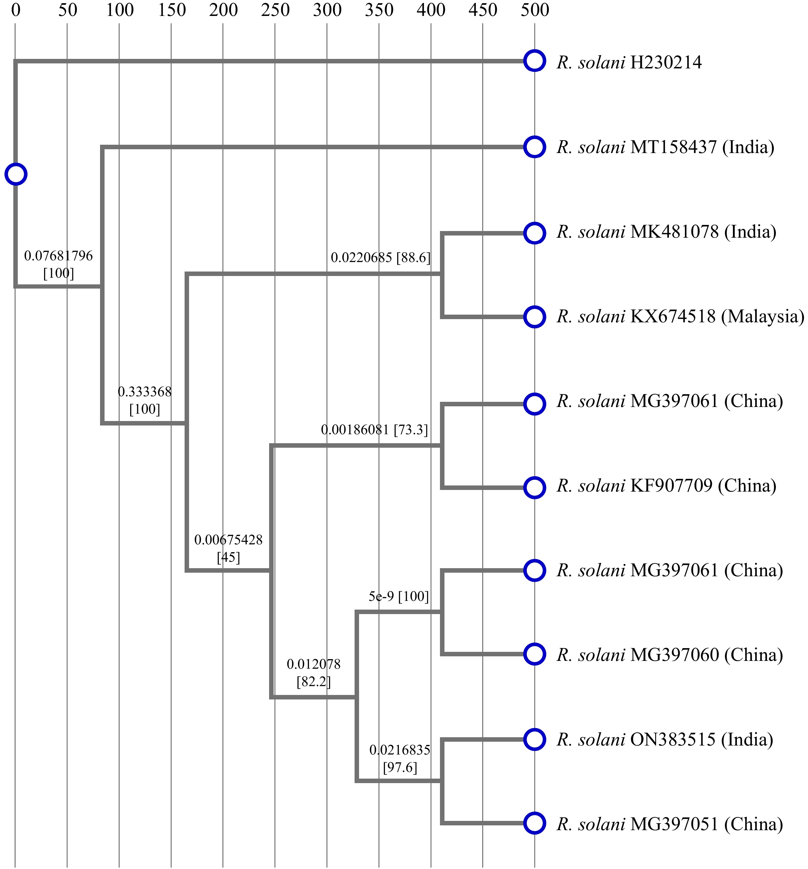 Phylogenetic relationship of R. solani H230214 deposited in NCBI. The optimal tree is shown. The percentage of replicate trees in which the associated taxa clustered together in the bootstrap test (10,000 replicates) are shown next to the branches.