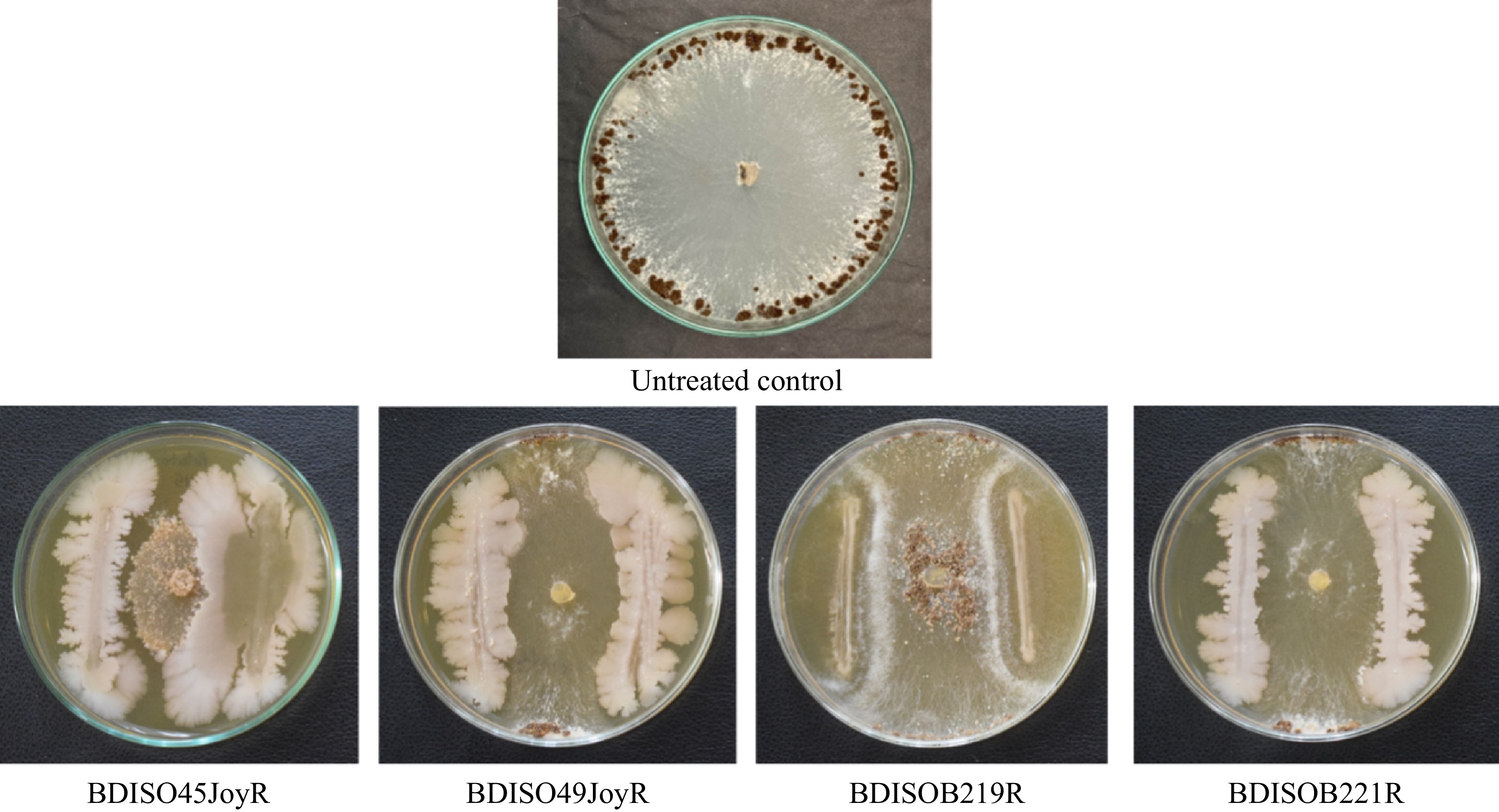 In vitro growth inhibition of R. solani by bacterial bioagents. BDISO45JoyR = B. subtilis, BDISO49JoyR = B. subtilis, BDISOB219R = P. taiwanensis, and BDISOB221R = Pseudomonas sp.
