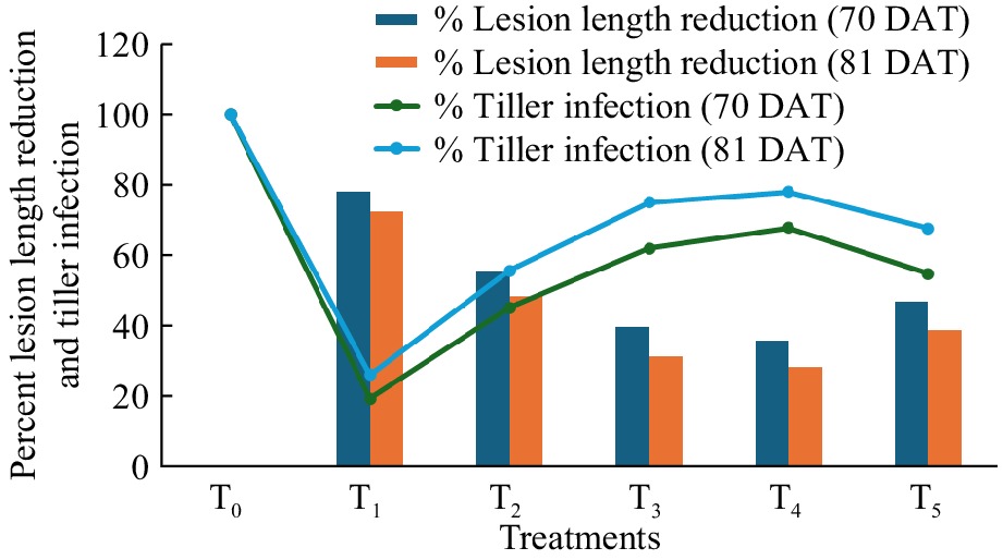 At 70 DAT, among the bacterial bioagents used in this study, plants treated with T2 showed a 54.80% reduction in tiller infection (Fig. 4). The treatments with T5, T3, and T4 resulted in 37.97%, 32.17%, and 45.20% reductions in tiller infection over the control, respectively (Fig. 4). By 81 DAT, the plants treated with T2 showed a 44.27% reduction in tiller infection, while T5, T3, and T4 showed reductions of 24.90%, 21.95%, and 32.31%, respectively (Fig. 4). The positive control, T1, performed better than all other treatments (Fig. 4). Compared to 81 DAT, the number of tiller infections was much lower at 70 DAT. This suggests that the bioagent treatments were effective in reducing the intensity of the pathogen early on. The bioagents largely controlled the pathogen, leading to a significant reduction in infection levels by 70 DAT.