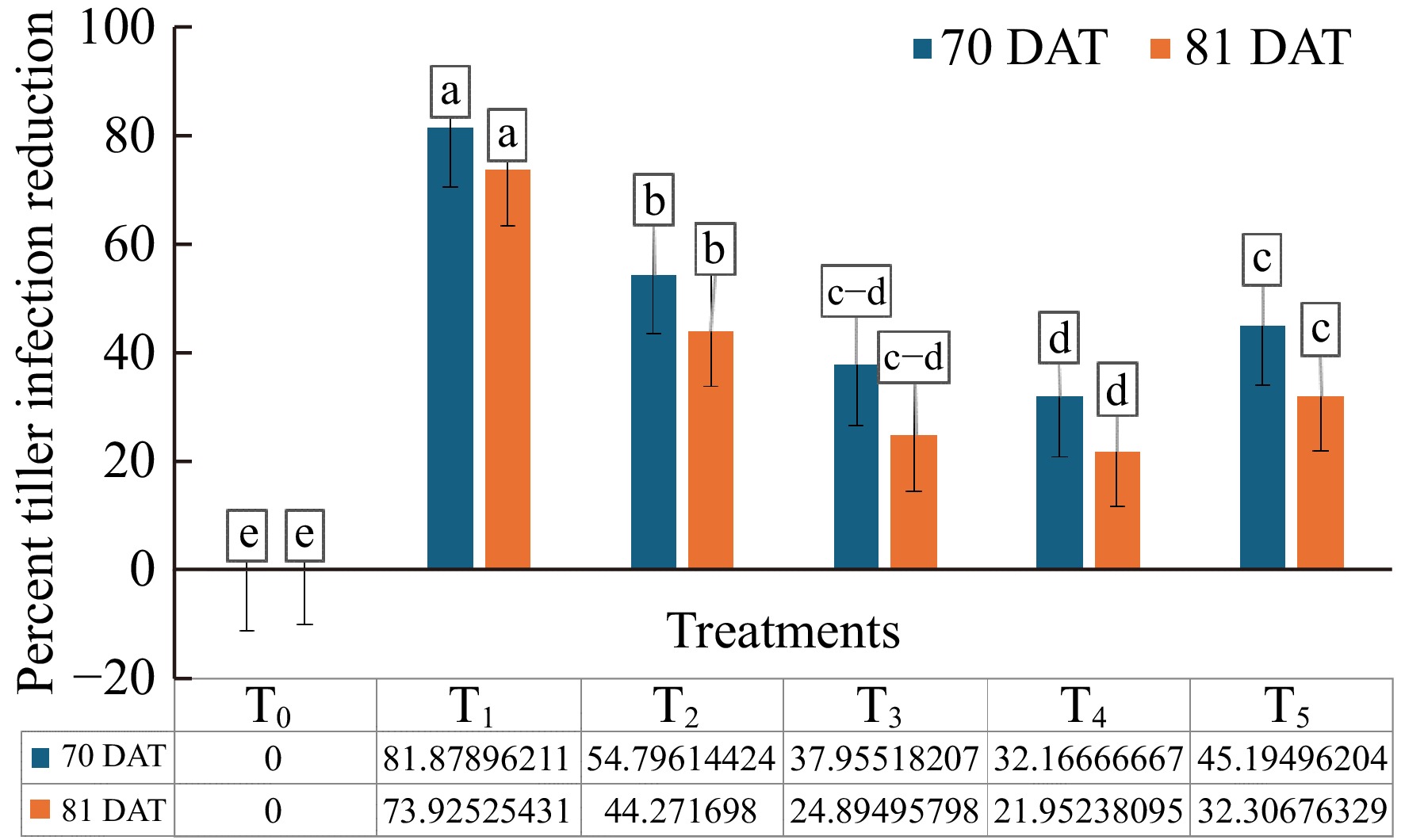 • At 70 d after treatment (DAT), plants treated with T2 had the lowest percentage of tiller infection (45.20%), whereas T5, T3, and T4 had 54.81%, 62.05%, and 67.83% infection, respectively, compared to the control (Table 2). By 81 DAT, plants treated with T2 had the lowest tiller infection rate (55.72%) compared to the control (Table 2). T5, T3, and T4 had tiller infection rates of 67.69%, 75.11%, and 78.05%, respectively, while the positive control (T1) worked better than all other treatments (Table 2).