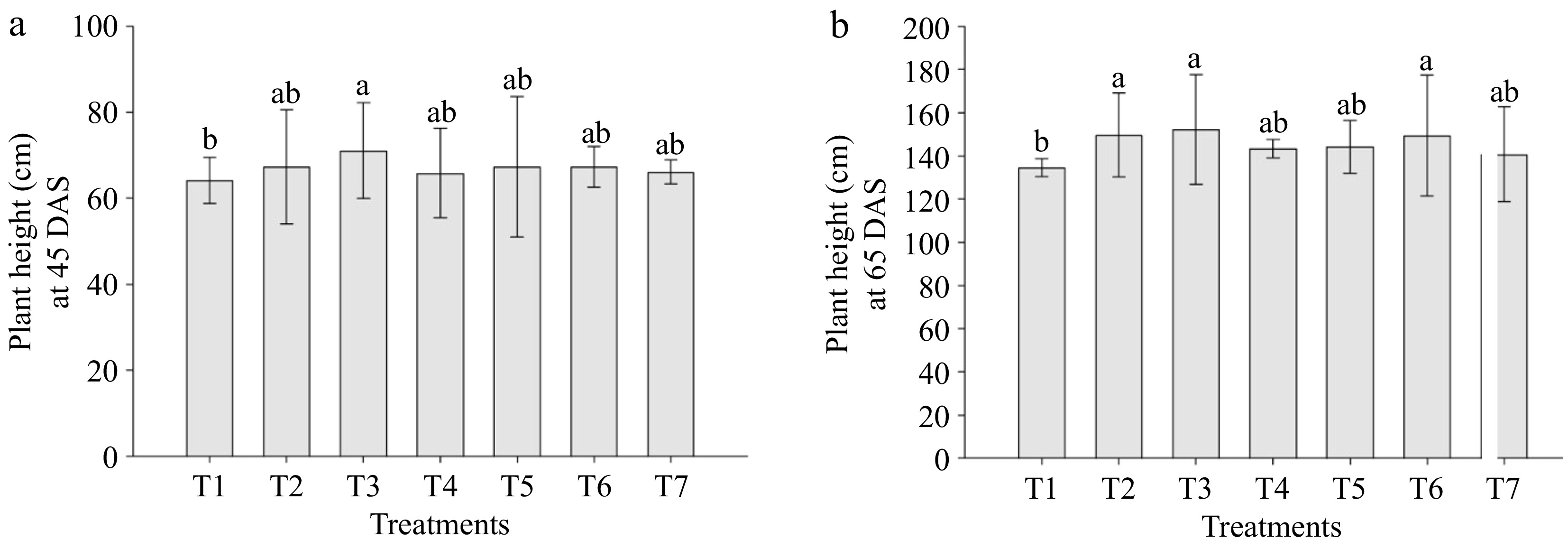 • It was found that treatments had significant effects on plant height measured at 45 and 65 days after sowing (DAS) at p value < 0.05 and < 0.1 respectively (Fig. 1). Plant height was the highest in T3 which was statistically similar to five other treatments except T1. Plants with the control treatment (T1) recorded the lowest height of 64.13 and 134.60 cm at 45 and 65 DAS respectively. The average height of plants in T3, which received the recommended NPK dose combined with phosphate solubilizing bacteria (PSB), was 71.04 cm at 45 DAS, and 152.27 cm at 65 DAS.