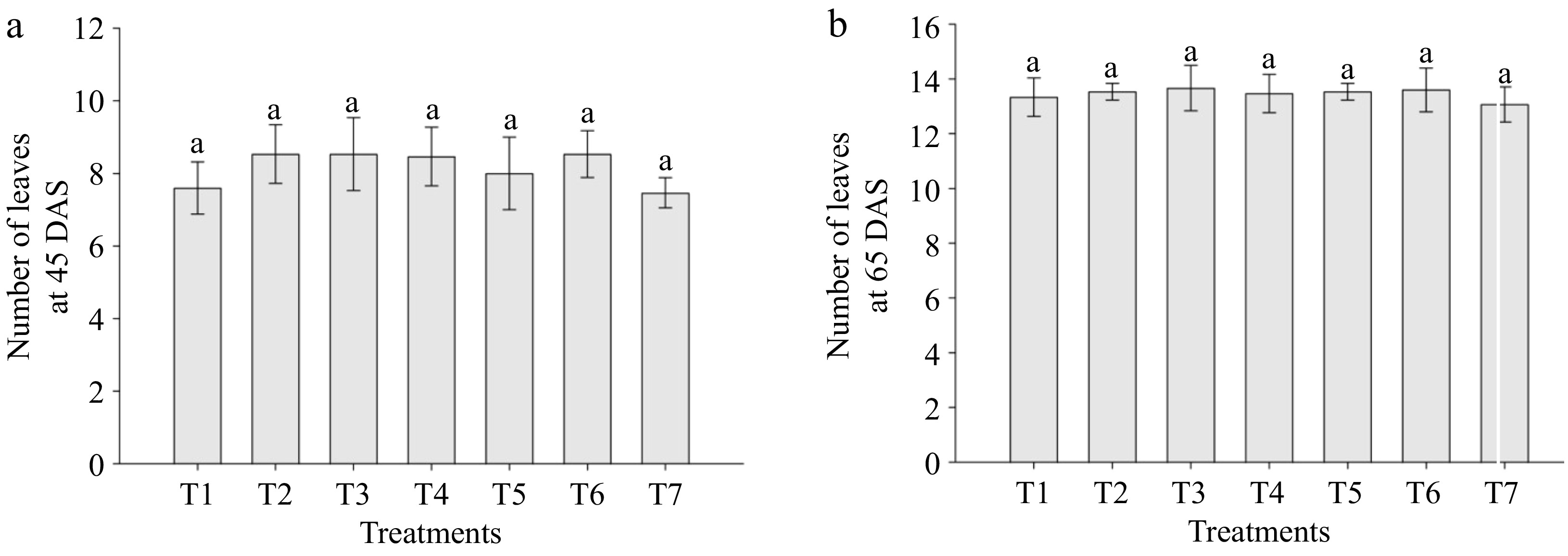 • At both observations, there were no statistically significant differences in the number of leaves in different treatments. As shown in Fig. 2, T3 and T7 consistently produced the highest and the lowest number of leaves respectively. The average number of leaves across all treatments was 8.15 at 45 DAS, and 13.46 at 65 DAS. Phosphorus had a noticeable effect on the number of leaves. In T1 and T7, the number was below the overall average at both 45 and 65 DAS, as phosphorus was not applied in the soil through fertilizers. On the contrary, in all the treatments where phosphorus fertilizer was applied, the number was on the higher side of the average. This suggests that the presence of phosphorus might have positively influenced the number of leaves in the maize plants, emphasizing its role in enhancing leaf production. This is supported by the findings reported by Zhu et al.[30], who found that an increase in phosphorus supply resulted in a rise in leaf count.