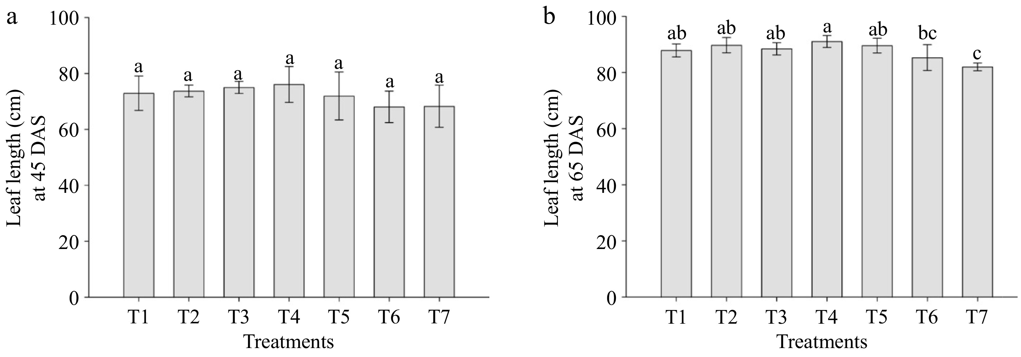 • The results were statistically similar on leaf length per plant at 45 DAS across all treatments, however, significant differences were observed at 65 DAS. The average leaf length at 45 DAS was 72.32 cm, while at 65 DAS it was 87.72 cm (Fig. 3). The leaves of T3 at 65 DAS were significantly longer than those of T6 and T7. The results imply that the presence of more phosphorus might have increased the photosynthetic capacity of maize resulting in the elongation of leaves. This is backed by a previous study by Nazir et al.[31] who stated that better root development and nutrient absorption were most likely the cause of high phosphorus levels on plants, resulting in positive effects on plant height and leaf area index.