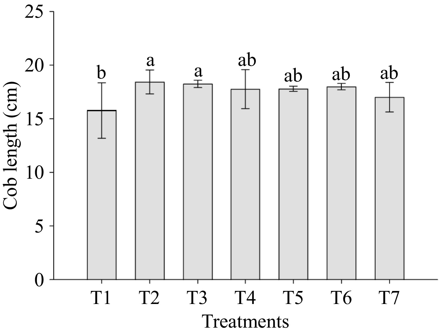 • As illustrated in Fig. 4, the average cob length was recorded as 17.58 cm, with T2 showing the maximum length (18.44 cm), and T1 showing the minimum (15.77 cm). A significant difference in cob length was observed between T1 and T2, as well as between T1 and T3. Chemical fertilizers played a key role in determining cob length, which is in alignment with Rawal et al.[34] who stated manures and fertilizers had a major impact on cob length. T1, where no input was applied produced the shortest cobs, demonstrating the impact of the absence of fertilization. Increasing phosphorus levels resulted in a progressive increase in cob length across the treatments with PSB application, aligning with previous research by Amanullah et al.[35], where it was stated that the length of maize cobs responded well to rising P levels.