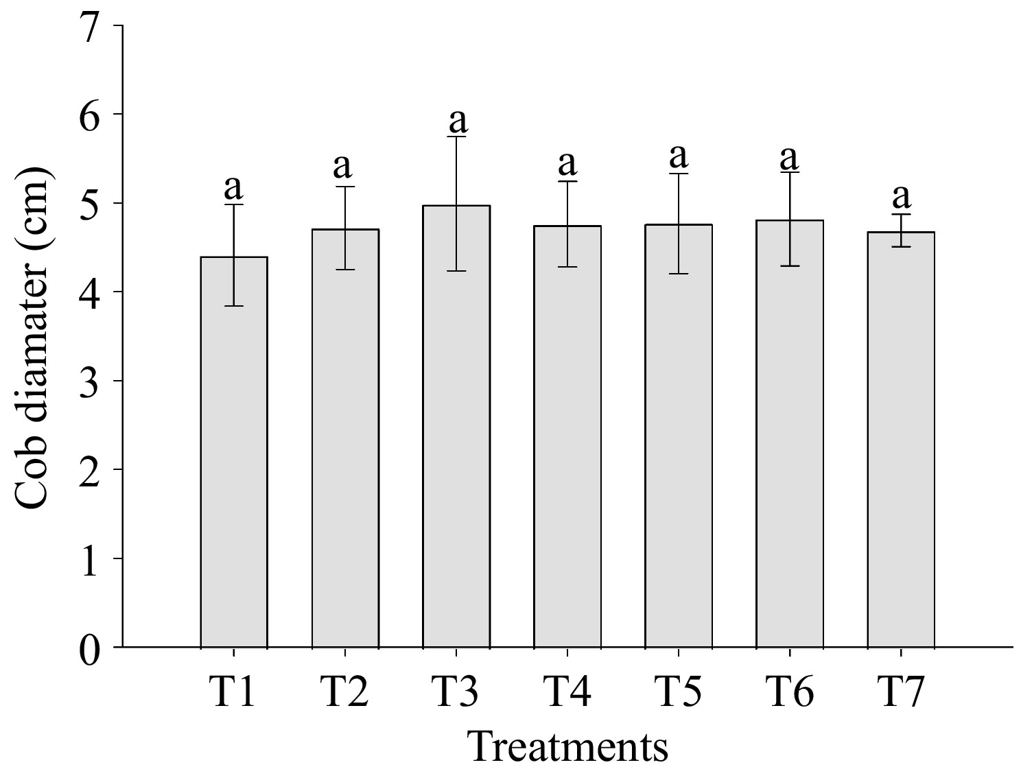 • It was observed that the average cob diameter was 4.74 cm, with T3 displaying the largest diameter, and T1 showing the smallest but the effects of the treatments resulted in a non-significant difference among the various treatments, as depicted in Fig. 5. Cob diameter was impacted by PSB as progressive increase in phosphorus with PSB application led to larger cob diameters in T4, T5, T6, and T3. The outcome was also influenced by the fertilizer rate, in line with the results of Tuong et al.[36], who observed an increase in cob diameter as the fertilizer rate increased.