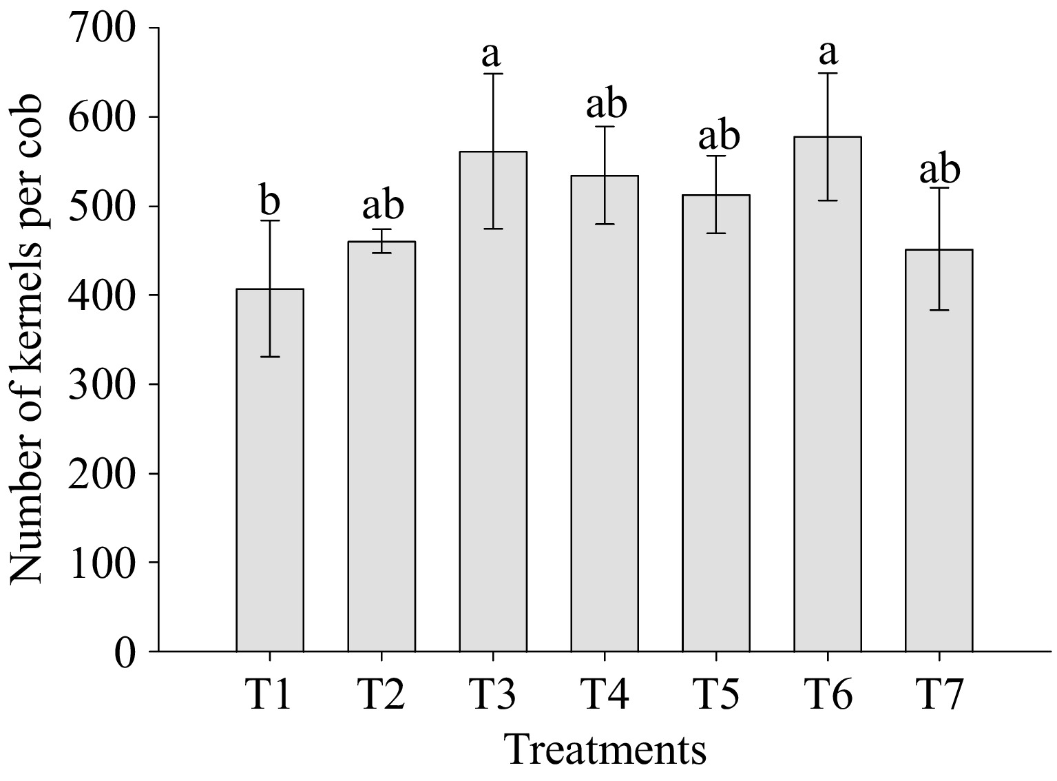 Yield was also notably affected by various yield attributes, including cob length, cob diameter, and the number of kernels per cob. T1 exhibited the smallest cob diameter, shortest cob length, and lowest number of kernels per cob, resulting in the lowest yield. These findings align with Raut et al.[40] who conducted a correlation analysis and found that yield traits such as grains per row, grain rows per cob, ear diameter, and ear length had a positive correlation with grain yield.