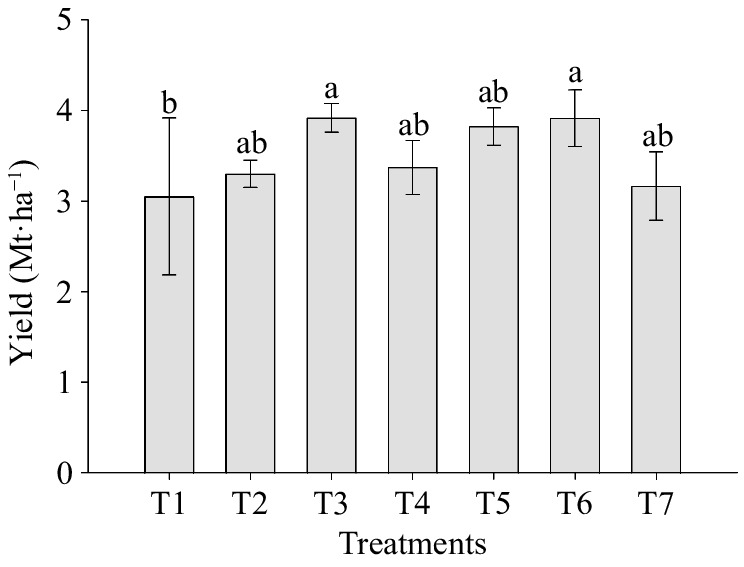 • The average yield for maize was measured as 3.5 Mt·ha−1, with T3 yielding the highest, and T1 yielding the lowest (Fig. 7). Significant differences in yield were observed between T3 and T1. T1, which did not receive any chemical fertilizer, had the lowest yield, while T2, which received the recommended NPK dose, yielded slightly below the average. Increasing the amount of phosphorus fertilizer corresponded to a progressive increase in yield. As mentioned by Penn et al.[39], increased P uptake by maize plants increased the overall biomass and grain yield until peak production was reached.