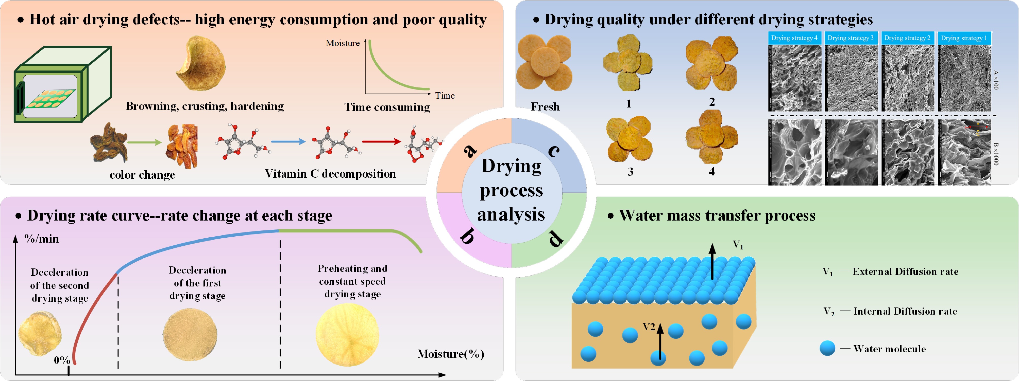 Drying process analysis. (a) Hot air drying defects, high energy consumption and poor quality. (b) Drying quality under different drying strategies. (c) Drying rate curve, rate change at each stage[16]. (d) Water mass transfer process.