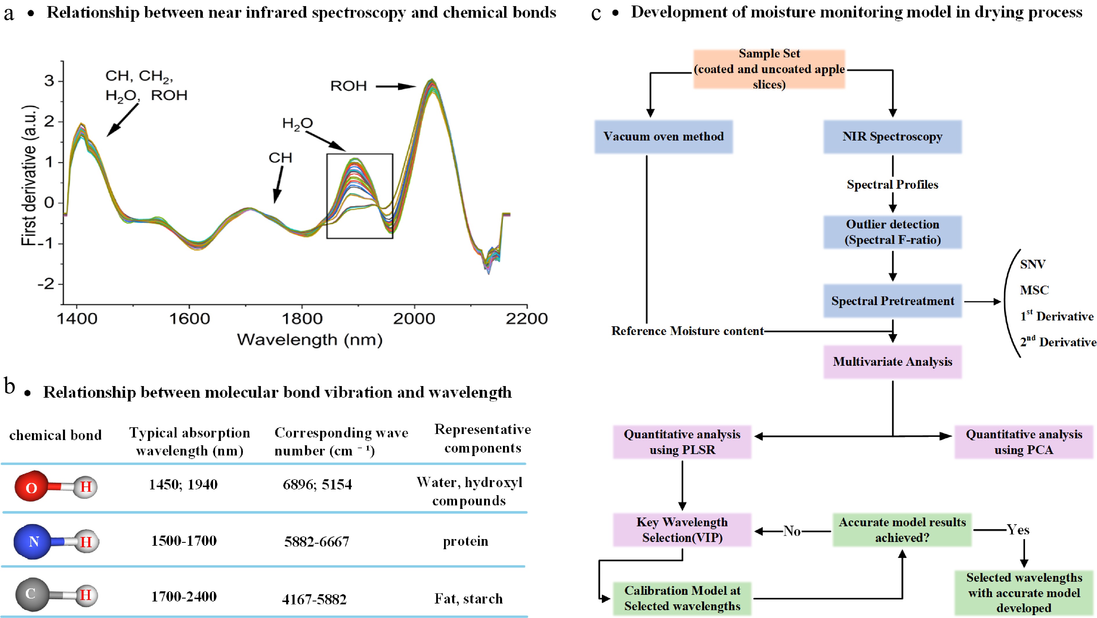 Near-infrared (NIR) spectroscopy is a technique based on the absorption of electromagnetic radiation in the wavelength range of 780–2,526 nanometers (nm). In recent years, it has gained recognition as a powerful analytical method for monitoring drying processes due to its advantages, such as rapidity and non-destructiveness[35]. At the molecular level, food or agricultural products are maintained by various molecular bonds. The electromagnetic wave's passage through the food sample leads to a change in its energy, resulting from the bending or stretching vibration of chemical bonds, such as O-H, C-H, and N-H. As demonstrated in Fig. 3a and b[36], the NIR spectra of agricultural products contain information regarding the vibrational behavior of molecular bonds, including C-H, O-H, and N-H. Through the interpretation of these spectra, the moisture content[37,38], protein, fat[39], and cellulose content of the agricultural products can be determined.