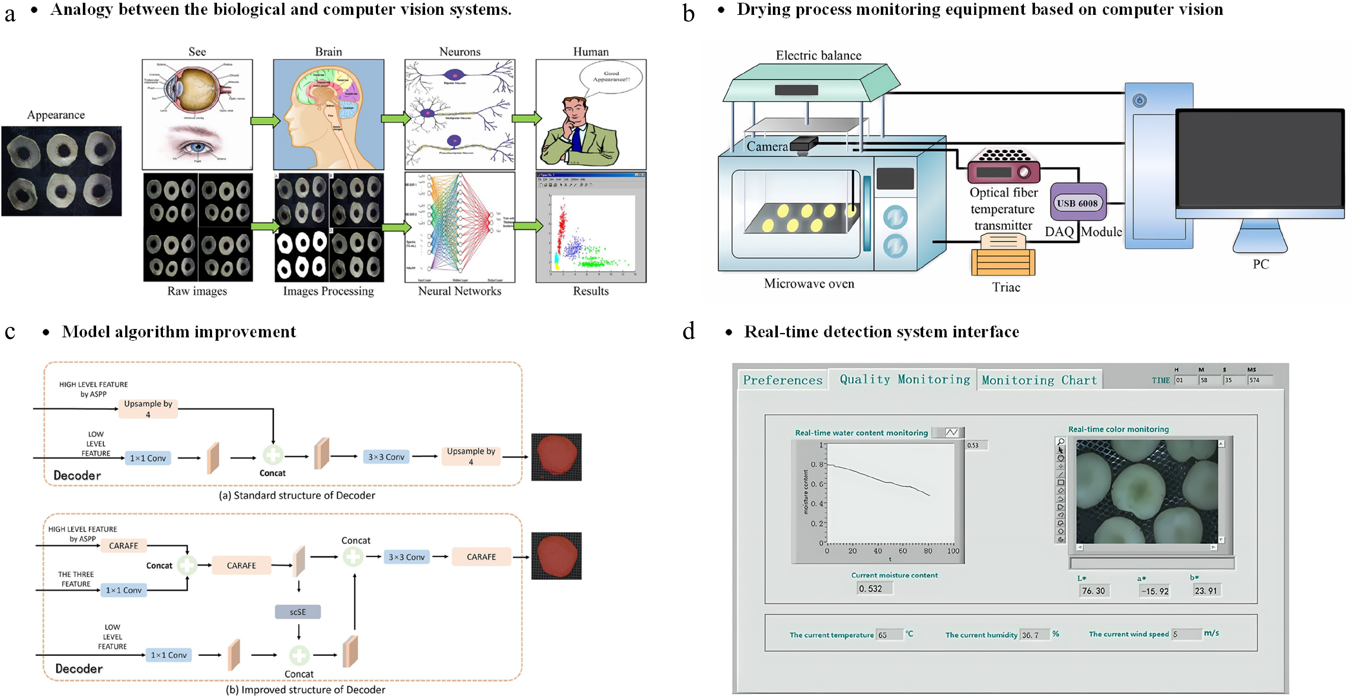 Computer vision systems have been utilized to oversee the drying process of agricultural products. Zhu et al.[50] developed a computer vision online monitoring microwave drying system (Fig. 4b). This system comprises an industrial camera, a microwave drying oven, an online quality inspection unit, a temperature sensor, and vision processing software. These components can also be employed in other continuous drying processes, such as hot air drying and superheated steam drying. Online recognition via computer vision critically relies on model improvements. As shown in Fig. 4c, Guo et al.[51] modified the DeepLabv3+ model to achieve real-time monitoring of the visual quality of king oyster mushrooms. Additionally, human-machine interaction interfaces enhance the accessibility of drying progress tracking. As shown in Fig. 4d, Zang et al.[52] developed an interactive platform for real-time monitoring of color and moisture changes during jujube slice drying, enabling simultaneous observation of drying curves and chromatic transitions.