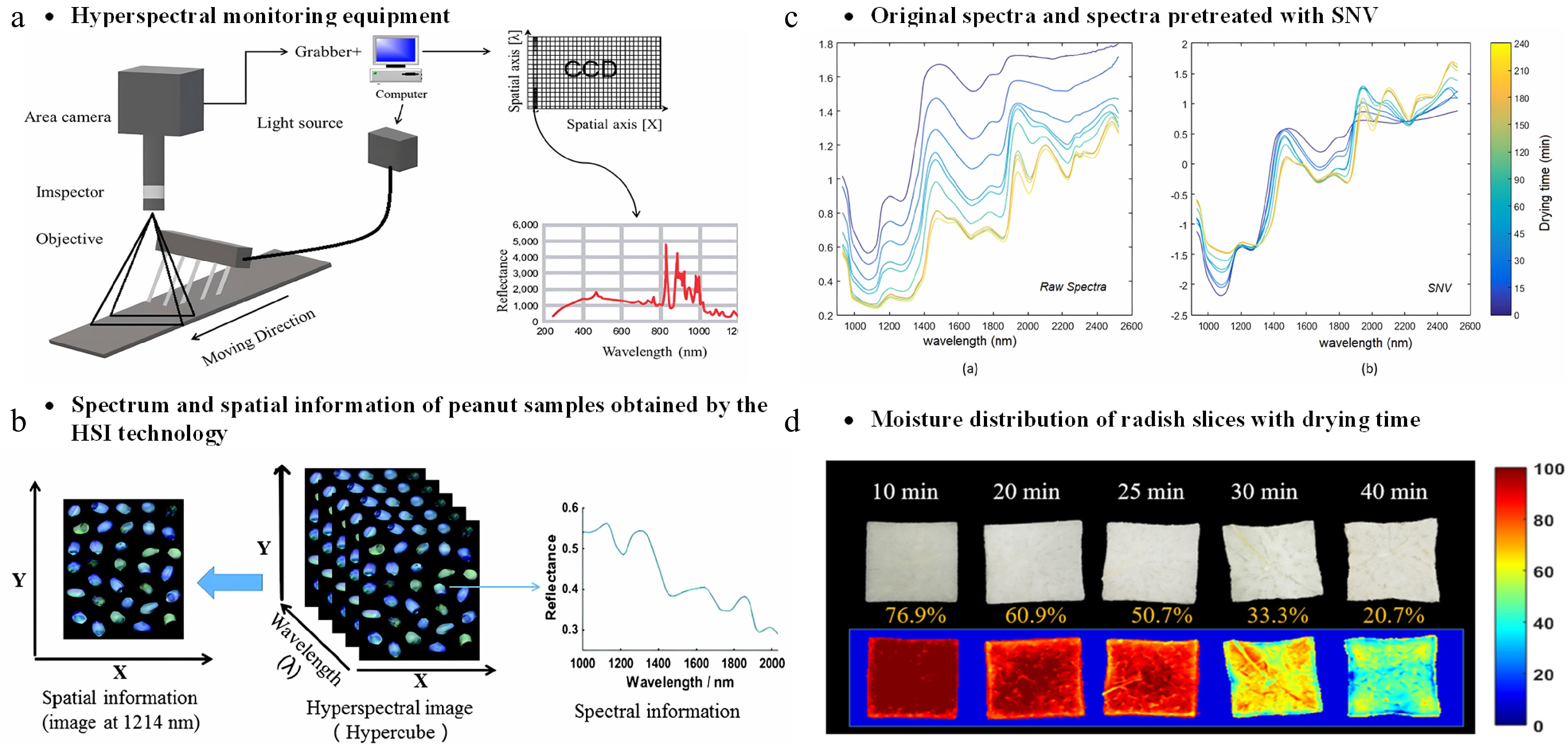 Hyperspectral detection of drying process. (a) Hyperspectral monitoring equipmentr[73]. (b) Spectrum and spatial information of peanut samples obtained by the HSI technology[74]. (c) Original spectra and spectra pretreated with SNV[79]. (d) Moisture distribution of radish slices with drying time[75].