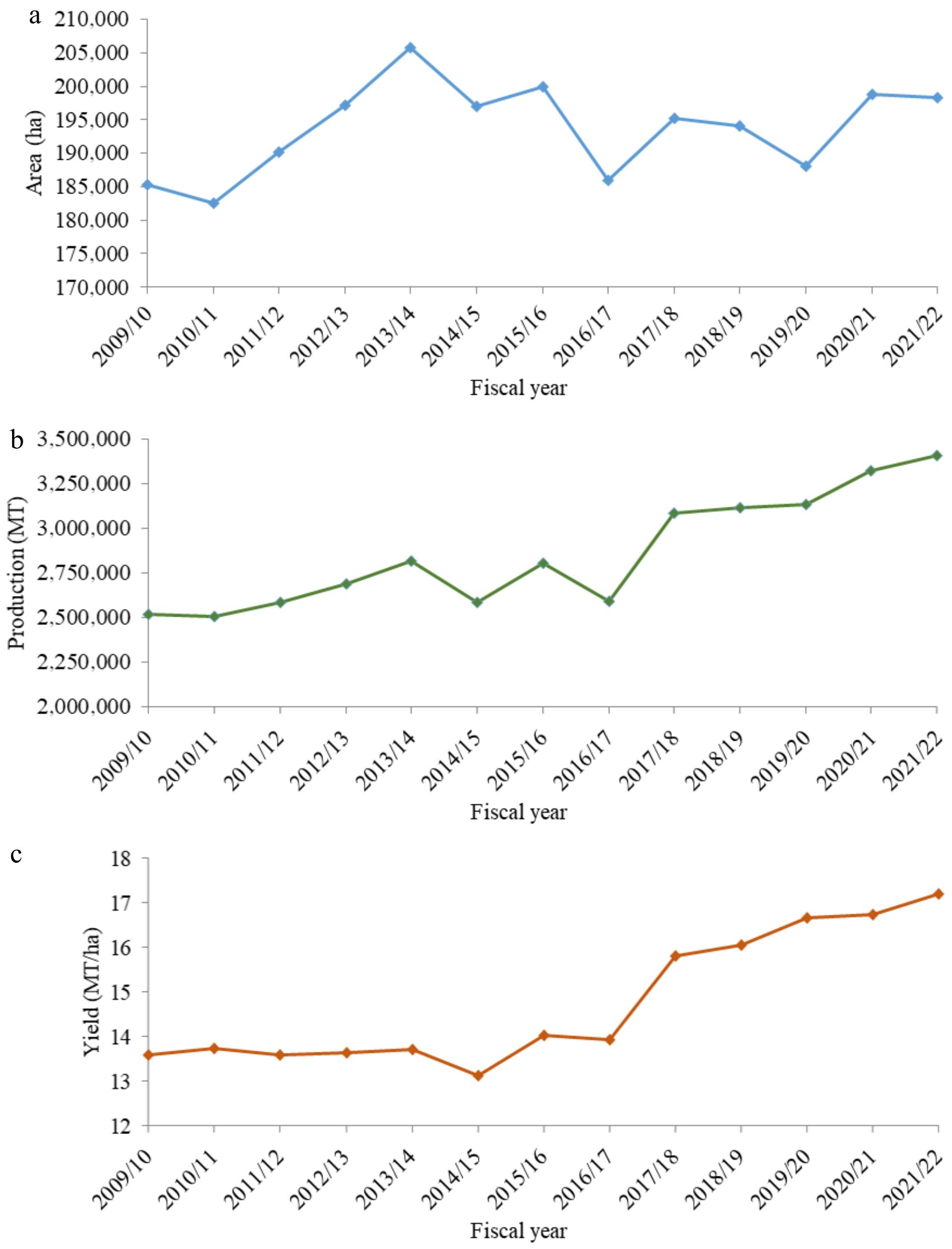 Horticulture and cash crops contribute between 25% and 35% of agricultural GDP (equivalent to 16.29% of national GDP), with potatoes alone contributing 7.36%[3]. Overall, cash crops cover a total area of 529,800 ha with an average productivity of 13.95 MT/ha, and a total production of 6,806,810 MT. Specifically, the potato has a productive area of 198,788 ha (37.52% of the cash crop area) with 16.73 MT/ha productivity and 3,325,231 MT production during 2020/21[3]. Figure 1 illustrates trends in area, production, and yield over the past 13 years. As shown in Fig. 1, a sharp decline in potato cultivation around 2016/17 can be attributed to several factors, including severe impact of the 2015 earthquake, fuel crisis and prolonged border blockade (2015–16), climate disruptions, weak agricultural policy support, inadequate storage infrastructure, and delays in decentralization post constitution (2015). But the subsequent recovery afterward, correlates with post-earthquake recovery schemes on restoration of infrastructure, agricultural tools and inputs, stabilized supply chains and fuel access, improved markets, and local government subsidies for fertilizer and seed distribution. Despite growing domestic production, Nepal imported potatoes worth NRs 8.9 billion in 2020/21 (Fig. 1b, Supplementary Table S1), indicating persistent supply-demand gaps. Therefore, given its adaptability, wide cultivation range, and economic importance, potato production remains a key strategy for meeting Nepal's growing demand for fresh and processed foods in an evolving socioeconomic landscape.