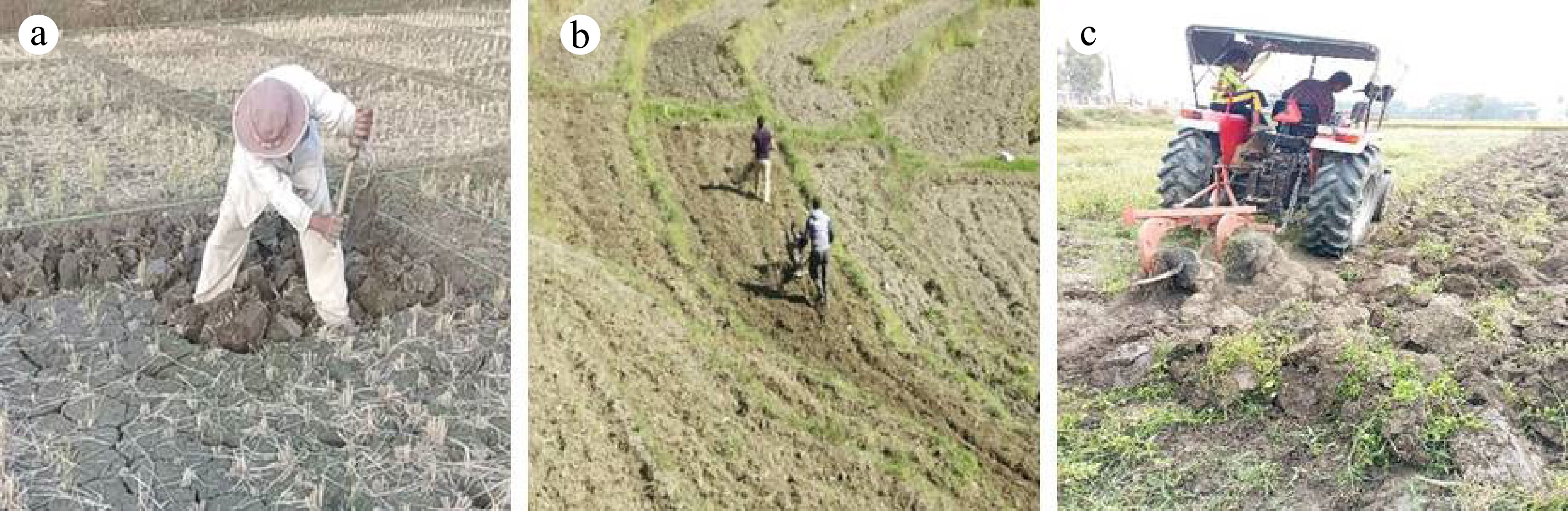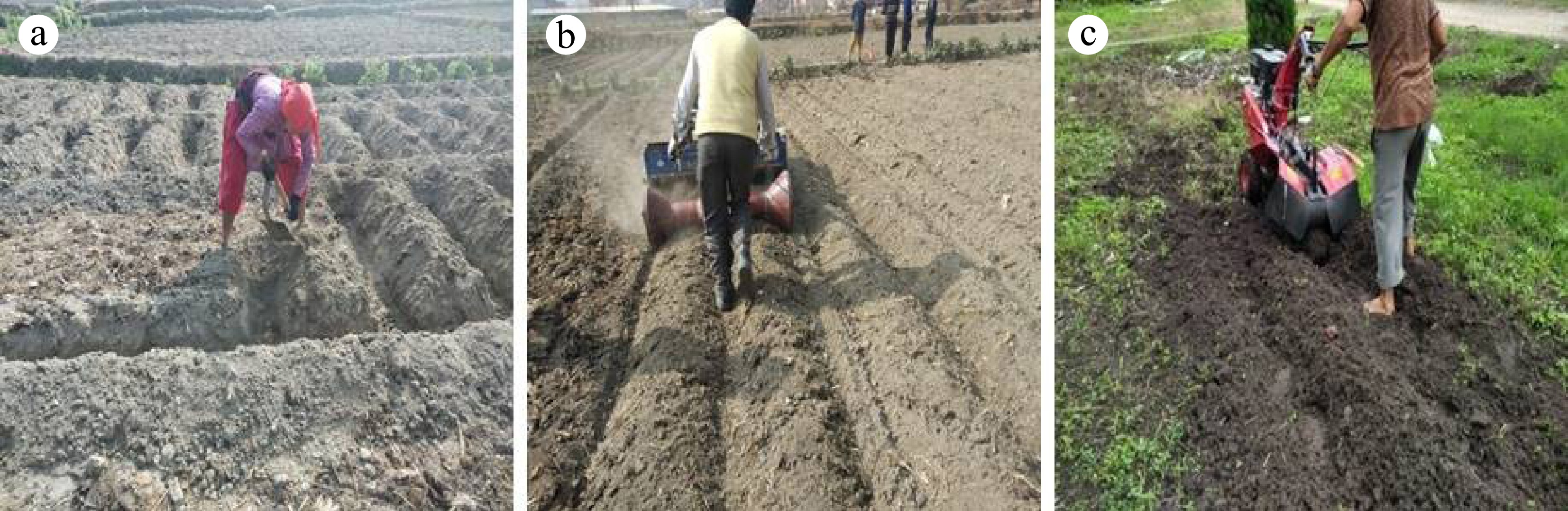 (a) Comb type bed forming using spade. (b) Power tiller bed former. (c) Mini tiller ridger.