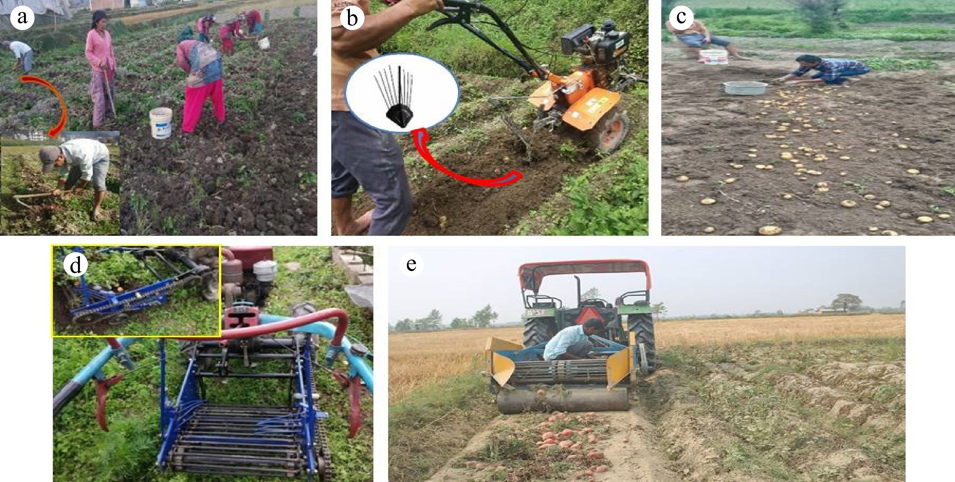 (a) Manual digging. (b) Mini tiller digger. (c) Collection of digger harvested potatoes. (d) Power tiller digger. (e) Four-wheel tractor attached potato digger (Image 'e' adapted from Bidari[13]).