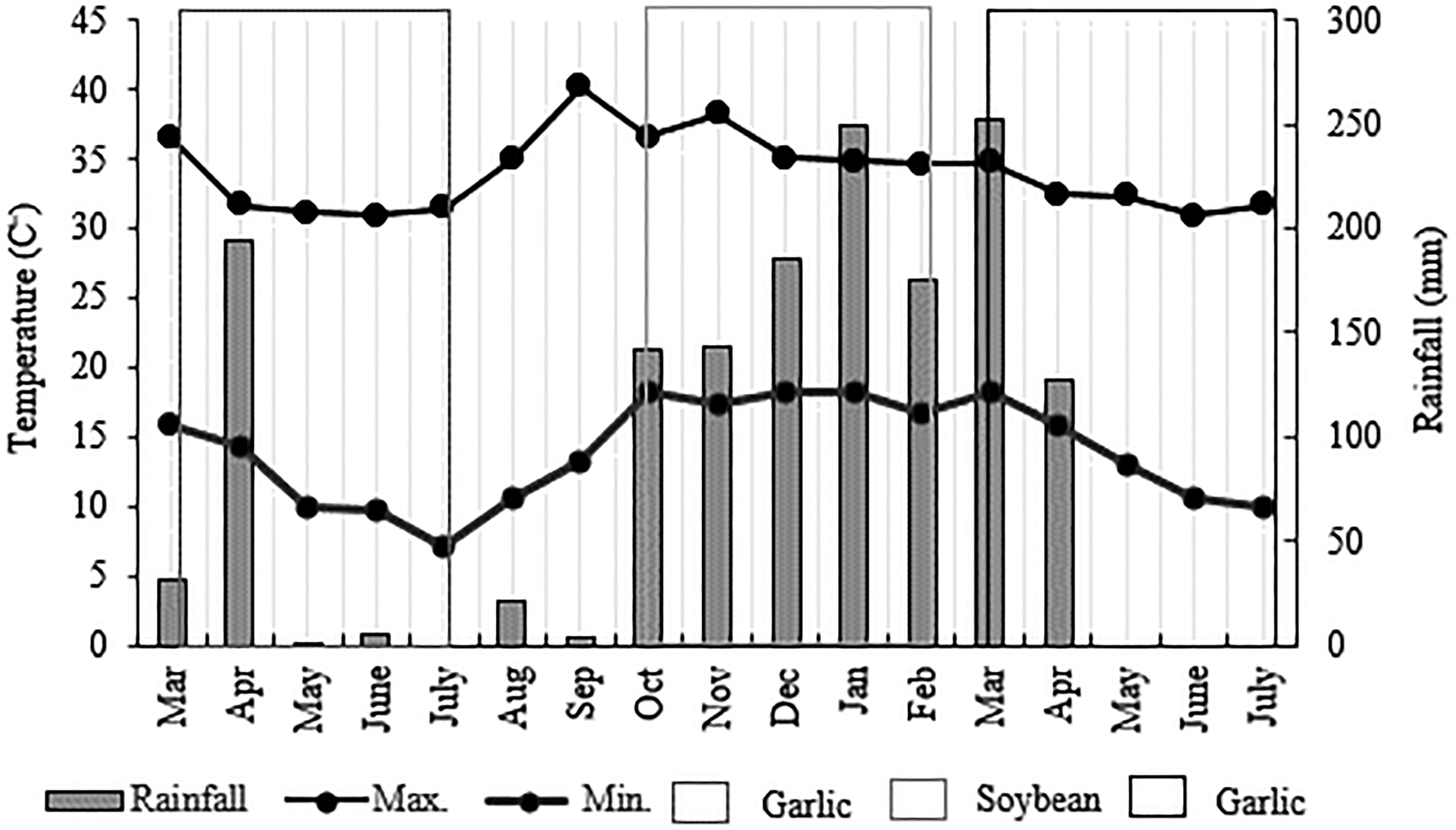 Precipitation, maximum and minimum air temperature in the 2023 and 2024 cropping seasons (garlic-soybean-garlic). Campo Alegre de Goiás-GO, Brazil. Source: iCRop weather station.