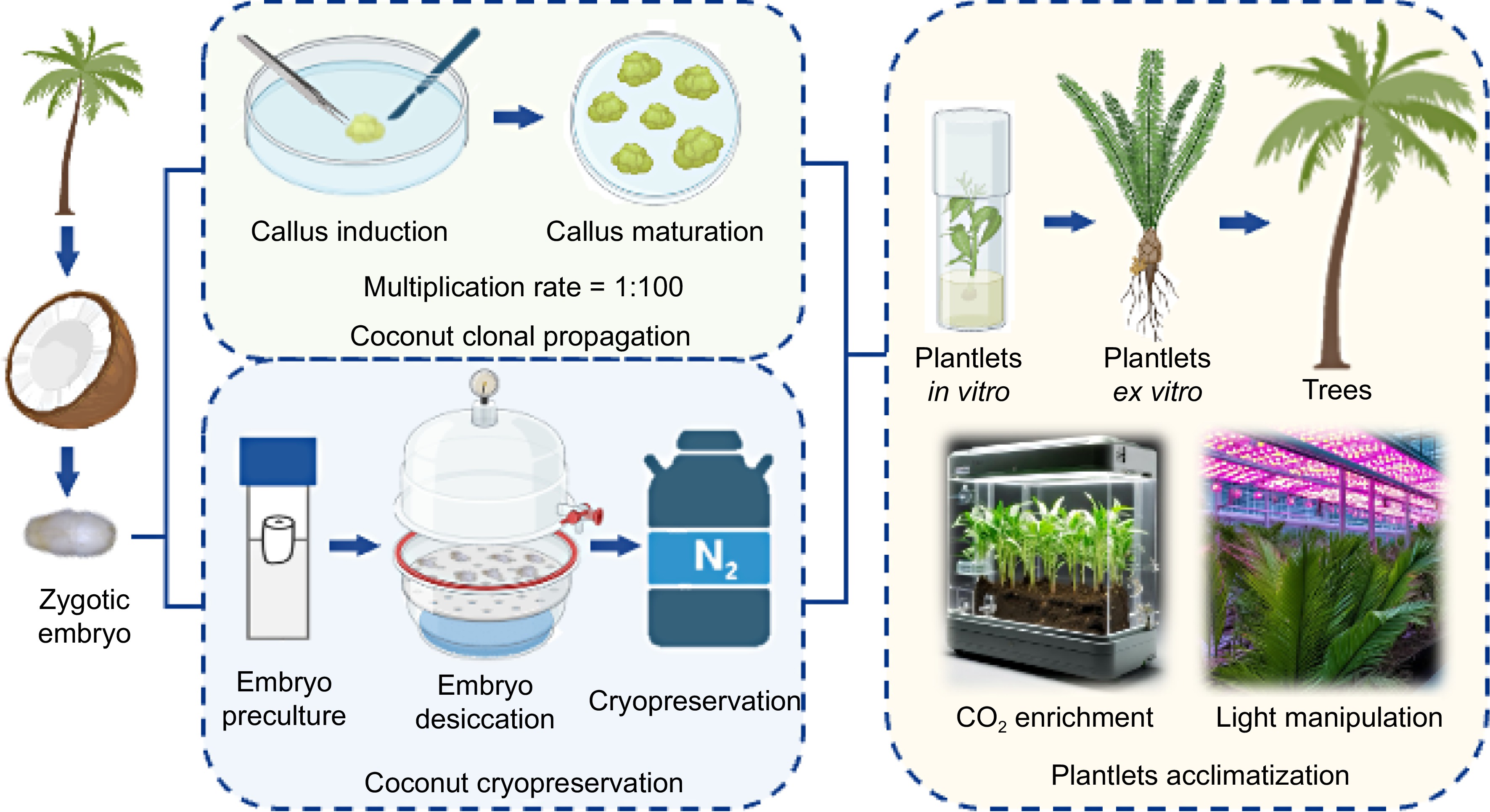 Regarding germplasm collection and precision breeding, a broader collection of diverse coconut varieties from different regions can preserve genetic diversity and uncover unique traits, such as extreme climate resilience and resistance to local pests, which can be crucial for breeding. Molecular breeding of coconut for climate adaptation can be conducted using gene-editing techniques like CRISPR, researchers could directly enhance traits related to climate adaptation—such as salt tolerance, drought resistance, and pest resilience—addressing the need for coconuts to thrive in harsher conditions. Meanwhile, with more rapid phenotyping technologies, breeders could more quickly assess how specific genetic markers manifest as desirable traits in different environments, optimizing the process of selecting and breeding resilient coconuts. In terms of biotechnologies, further development of somatic embryogenesis techniques could allow large-scale production of disease-free, genetically identical plants, essential for maintaining desirable traits in mass propagation. Then developing reliable methods to ensure genetic stability in cloned plants is vital to avoid unwanted mutations and maintain the genetic integrity of key traits during tissue culture. Incorporating genomic data can help identify elite genotypes and improve cloning success by tailoring culture conditions to specific genetic requirements. Finally, efforts to reduce the costs and technical demands of tissue culture could enable larger-scale adoption by farmers, ensuring widespread access to high-quality coconut planting material.
