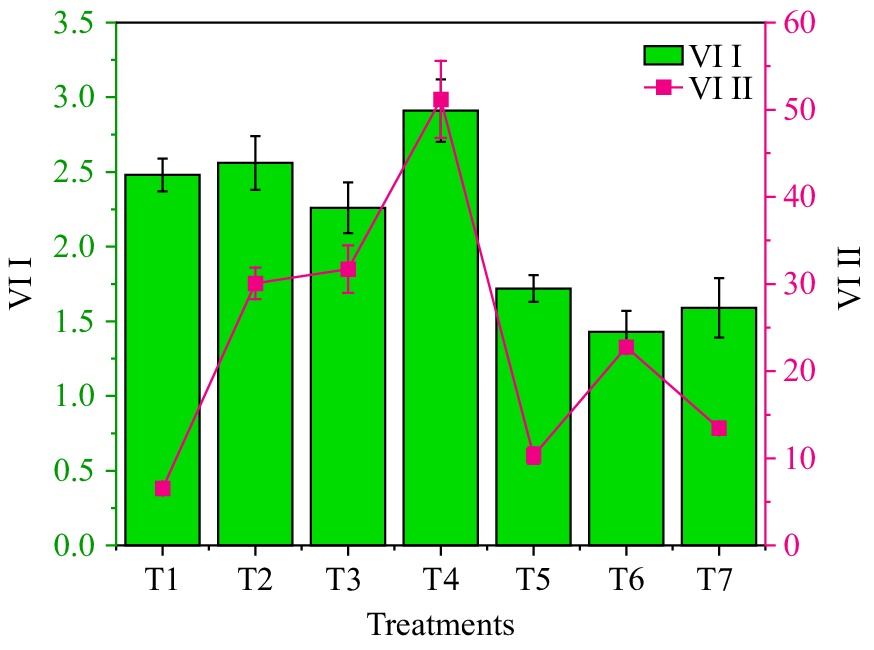 Vigour index with the different treatments (error bars with standard deviation) in Mucuna pruriens L. DC. var. utilis). [T1 (control), T2 (hot water 80 °C for 5 min), T3 (normal water for 24 h), T4 (H2SO4 1% for 5 h), T5 (KNO3 1% + HNO3 1% for 24 h), T6 (GA3 500 ppm for 24 h), and T7 (thiourea for 24 h); ASL = Average seedling length; DFG = Days for germination; GP/Germ% = Germination (%); Mort% = Mortality (%); SDW= Seedling Dry Weight; SP/Sur% = Survival (%); VI I = Vigour index 1; VI II = Vigour Index 2].
